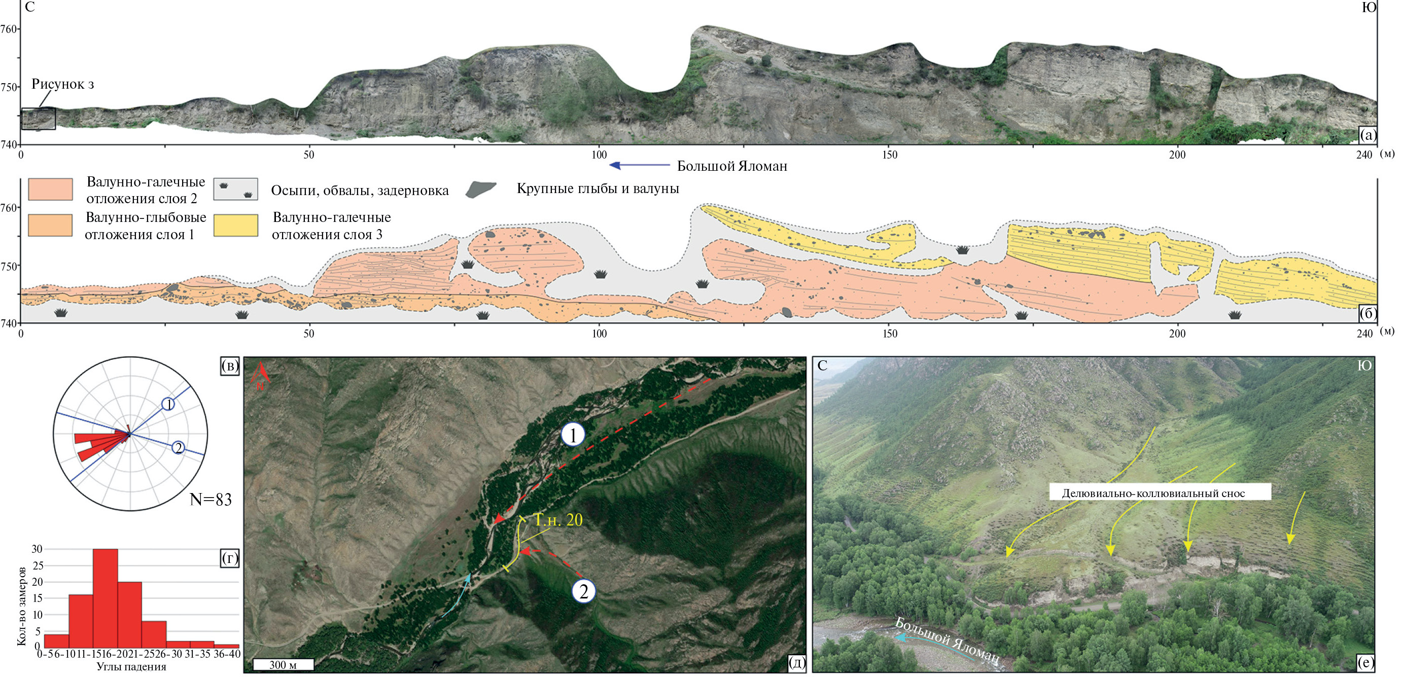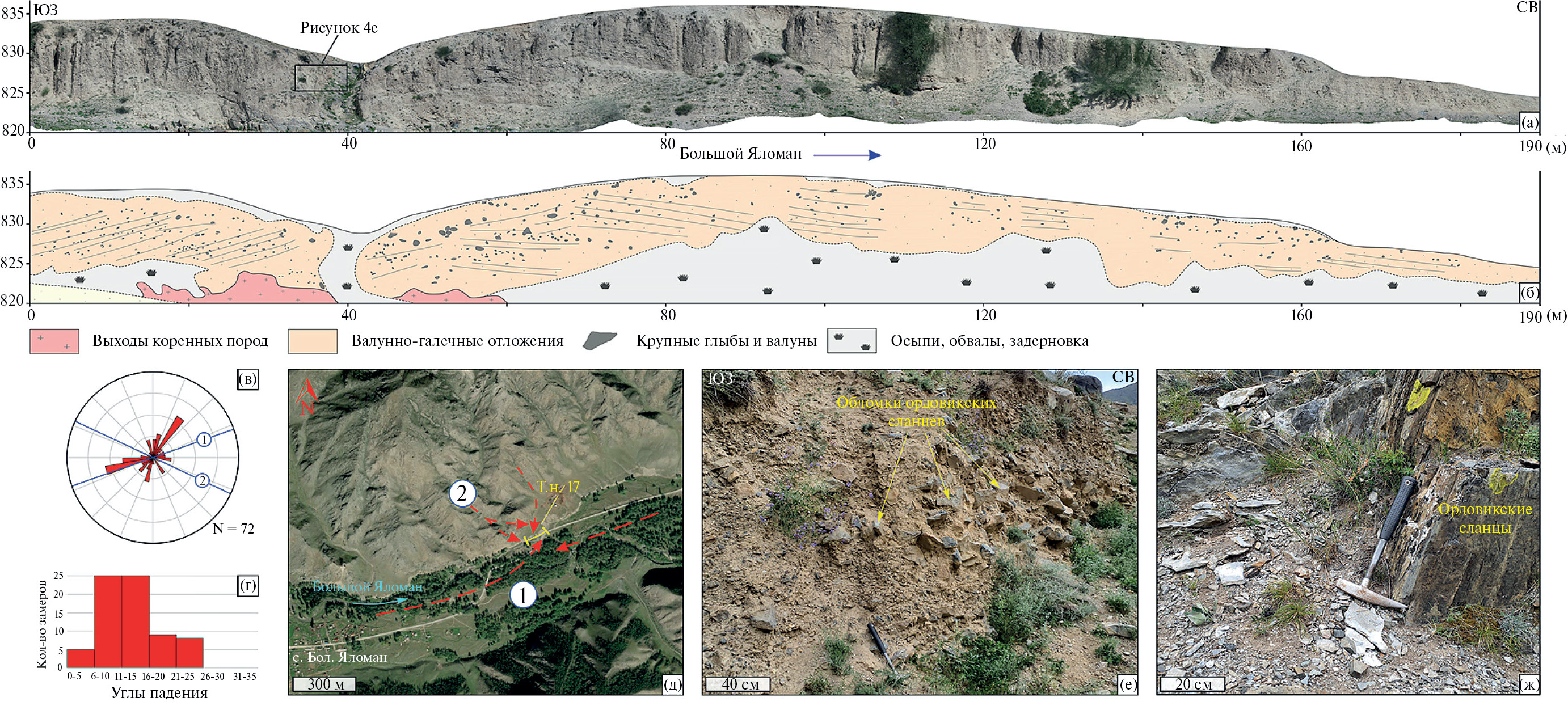 (а) – общий вид трехмерной модели т.н. 17 на р. Большой Яломан; (б) – ее геологическая интерпретация; (в) – общая роза-диаграмма ориентировок падений слоистости в отложениях т.н. 17; оси 1 и 2 (синие линии) – ориентировки долины р. Большой Яломан и боковой долины временного водотока в ее левом борту соответственно (отмечены номерами на рис. 4д); (г) – частотная диаграмма углов падений слоистости отложений в т.н. 17; (д) – спутниковая карта расположения т.н. 17 (источник: ArcGIS Imagery); красные пунктирные стрелки – предполагаемые преимущественные направления транспортировки обломочного материала согласно полученным ориентировкам падения слоистости; (е) – типичные грубообломочные отложения, вскрывающиеся в т.н. 17; (ж) – коренные выходы ордовикских сланцев ануйской серии и их обломки в левом борту р. Б. Яломан в районе т.н. 17.