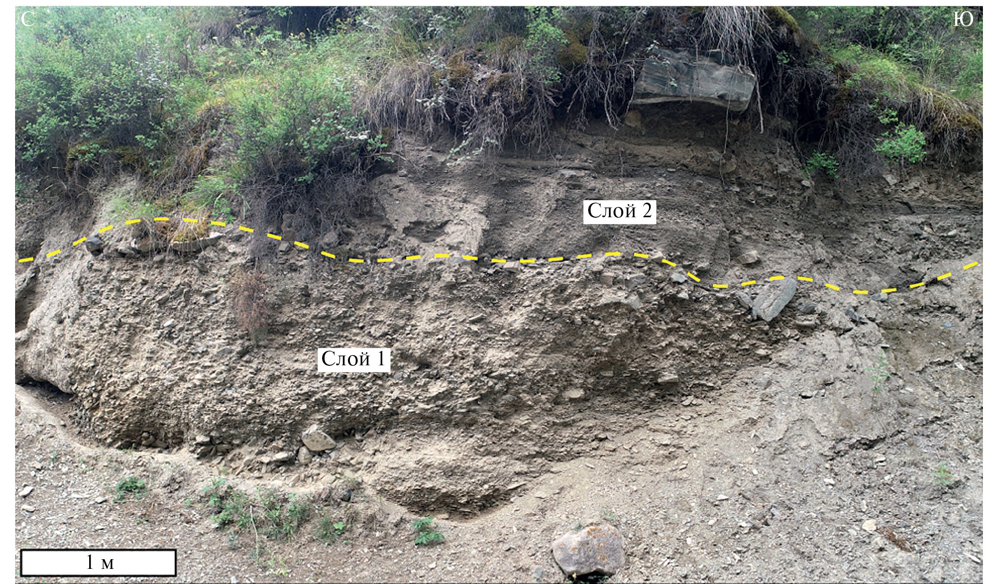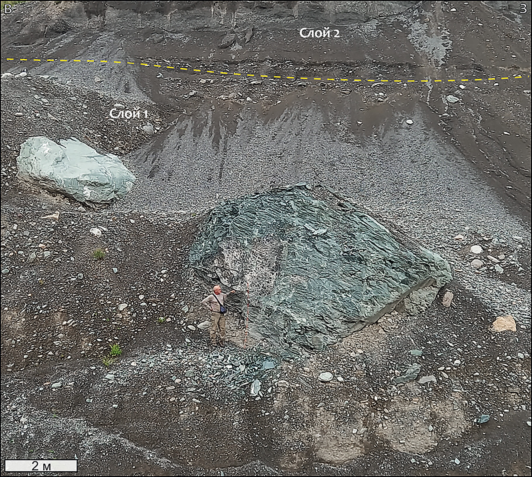 Рис. 3. Грубообломочные отложения слоев 1 и 2 на северном фланге т.н. 20.