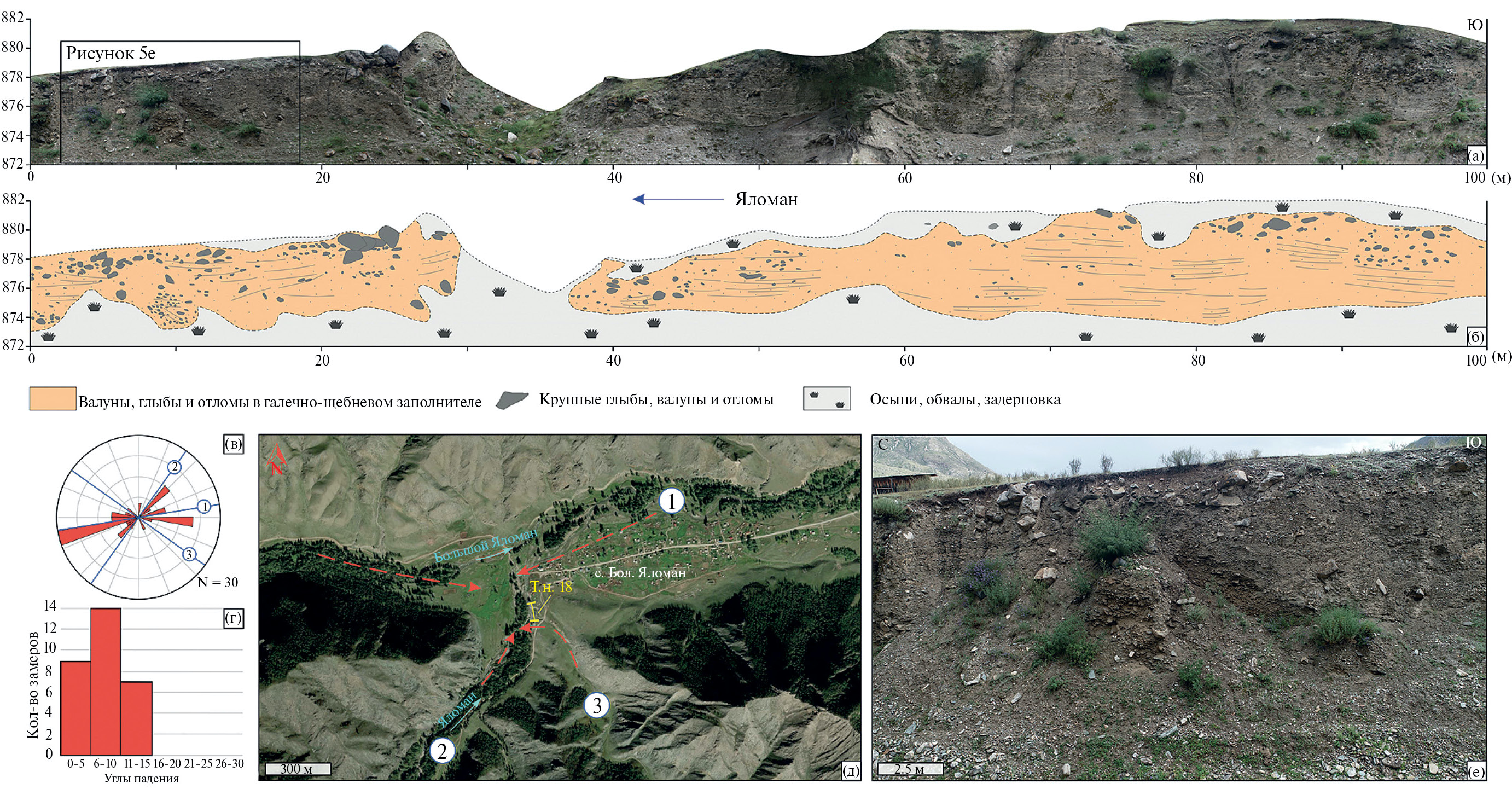 Считается, что т.н. 17 – самая верхняя по течению р. Б. Яломан точка распространения отложений селевой фации (Зольников, Мистрюков, 2008). Тем не менее еще одно примечательное обнажение (т.н. 18 на рис. 1б) расположено выше по течению, в правом борту р. Яломан, в 500 м на ЮЗ от места ее впадения в р. Б. Яломан, у западного края пос. Б. Яломан (рис. 5д). Обнажение вытянуто с севера на юг вдоль берега реки на 100 м, высота обнаженной части порядка 12 м (рис. 5а, 5б). В северной части (30–40 м) оно рассекается промоиной, выходящей из крупной боковой долины временного водотока СЗ–ЮВ простирания (рис. 5д). Здесь вскрываются отложения, в целом аналогичные представленным в предыдущих разрезах “селевой фации”: глыбо-галечно-валунный материал (до 1.5 м в поперечнике) несортированный, неокатанный, неявнослоистый (рис. 5е), редко слоистость подчеркнута прослоями желтовато-серых песков и алевропесков (мощностью 10–15 см). Углы падения слоистости субгоризонтальные (0°–5°) до слабонаклонных (6°–15°), ориентировки падения преимущественно ЗЮЗ (260°–270°), СВ (40°–45°) и В (90°–100°) (рис. 5в, 5г).