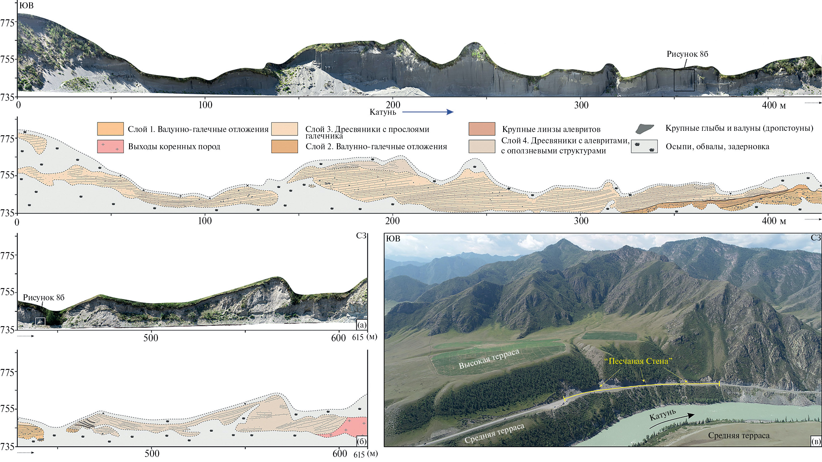 Разрез Песчаная стена. Является одним из самых известных разрезов четвертичных отложений Яломано-Катунской зоны в целом, в первую очередь ввиду его расположения вдоль федеральной трассы “Чуйский тракт”, в левом борту р. Катунь (т.н. 21, рис. 1б, 6в, 7а). Его протяженность около 600 м, высота обнаженной части достигает 44 м. Разрез вскрывает среднюю часть высокой “ининской” террасы (70 м над урезом реки), абсолютная отметка основания 735 м (рис. 6а–6в).