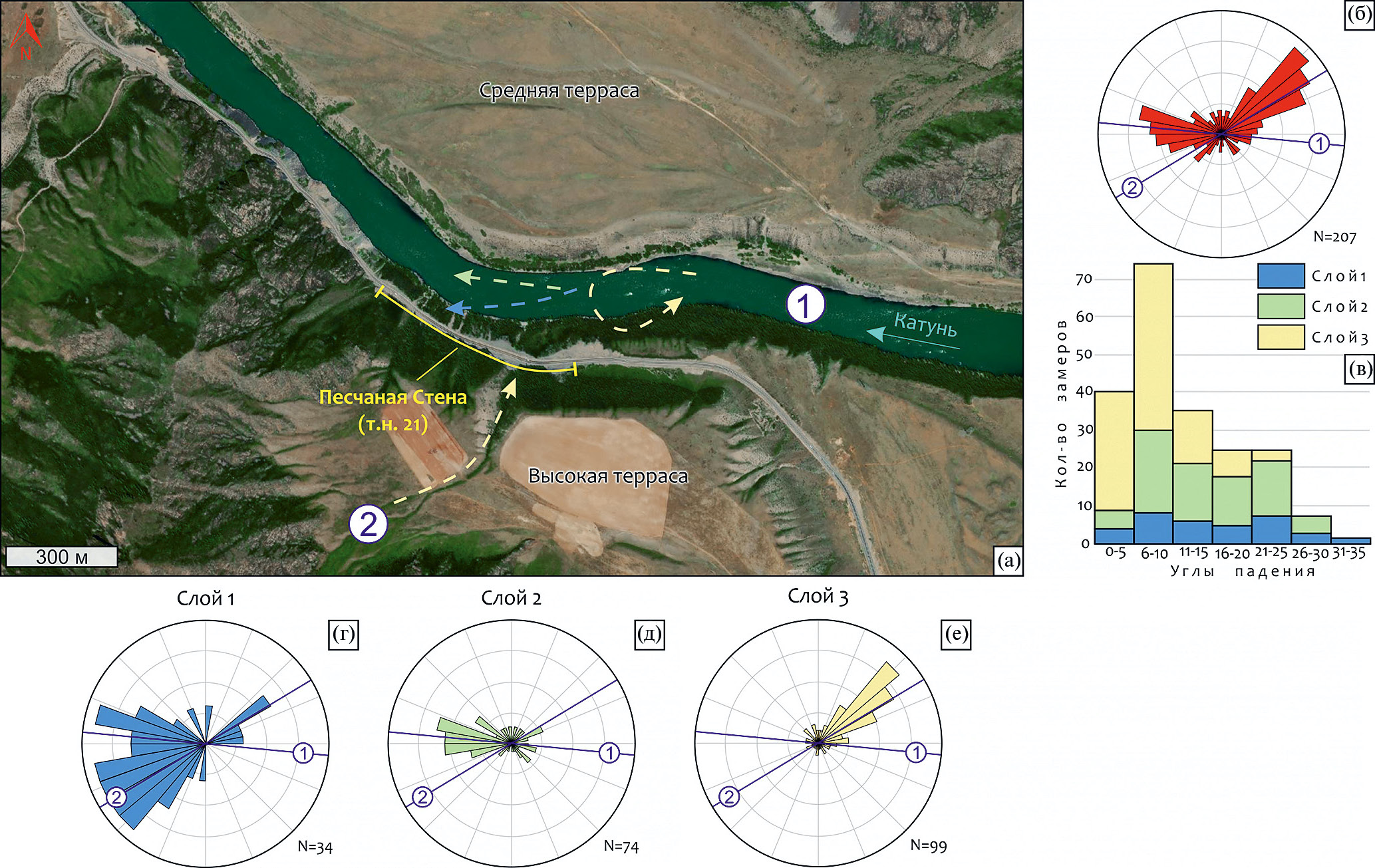 (а) – спутниковое изображение расположения разреза Песчаная стена (источник: ArcGIS Imagery); светло-синяя, светло-зеленая и светло-желтая пунктирные стрелки – предполагаемые преимущественные направления транспортировки обломочного материала слоев 1, 2 и 3 соответственно, согласно полученным ориентировкам падения слоистости; (б) – общая роза-диаграмма ориентировок падений слоистости в слоях 1, 2 и 3; оси 1 и 2 (синие линии) – ориентировки долины р. Катунь и небольшой боковой долины временного водотока в ее левом борту соответственно (отмечены номерами на рис. 7а); (в) – частотная диаграмма углов падений слоистости в слоях 1, 2 и 3; (г) – роза-диаграмма ориентировок падений слоистости слоя 1; (д) – роза-диаграмма ориентировок падений слоистости слоя 2; (е) – роза-диаграмма ориентировок падений слоистости слоя 3.