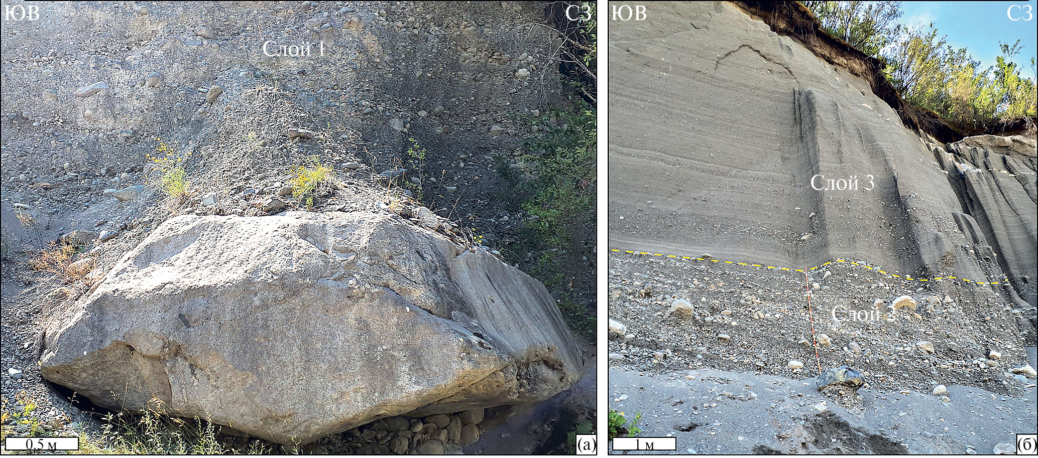 Рис. 8. (а) Крупная глыба в валунно-галечниках слоя 1 разреза Песчаная стена; (б) характер контакта валунно-галечников слоя 2 и дресвяников слоя 3.