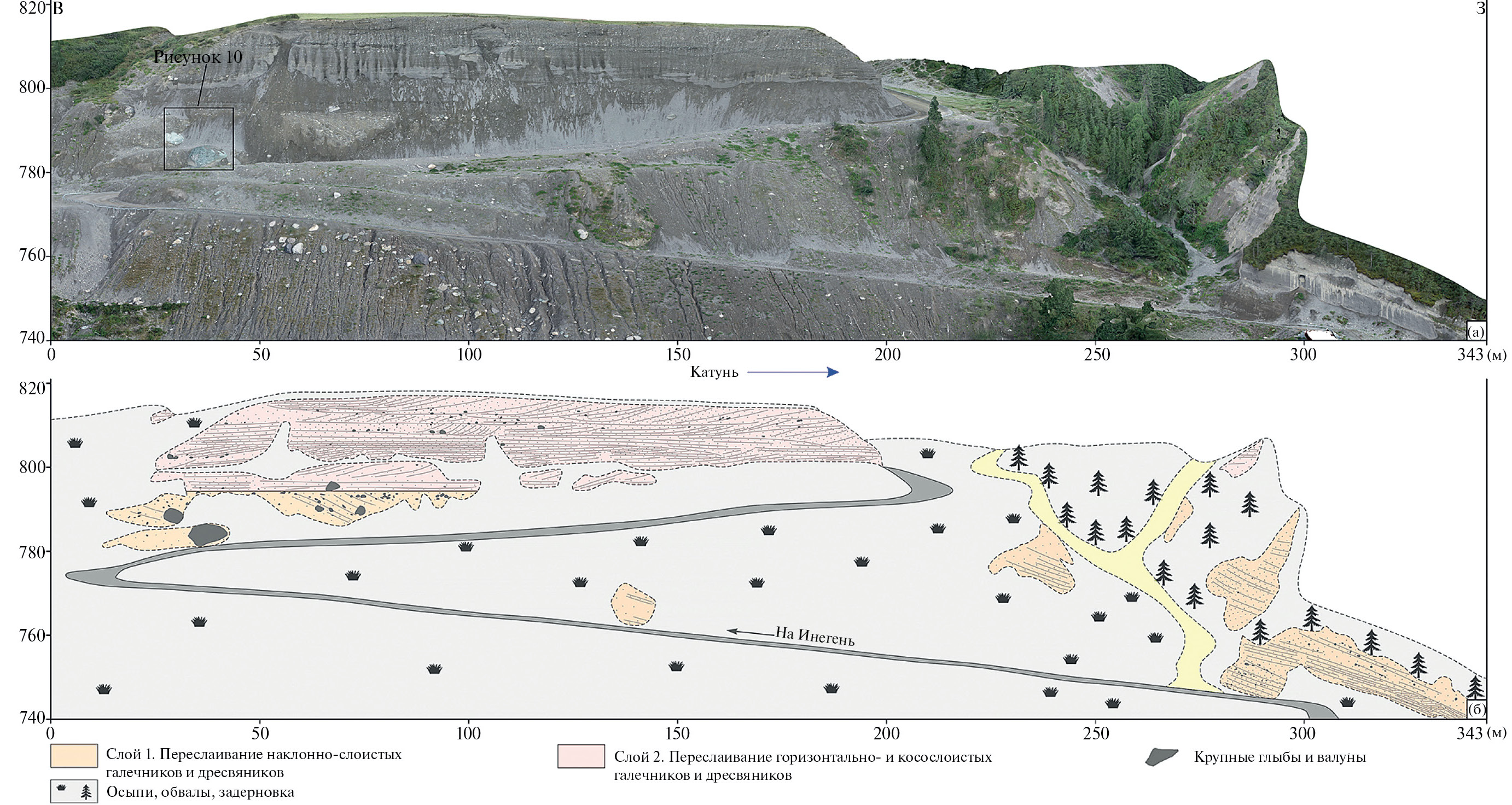 Слой 1, обнажающийся главным образом ниже по течению в левом борту боковой долины временного водотока, представлен выдержанными наклонно-слоистыми образованиями, а вышележащий слой 2 преимущественно горизонтально-слоистый, с невыдержанными прослоями с косой слоистостью (рис. 10б). В дресвяниках и галечниках встречены валуны и глыбы до 4–5 м в поперечнике (рис. 11). Для слоя 1 характерны слабонаклонные и пологие падения слоистости (10°–30°), ориентированные вниз по долине р. Катунь (250°–300°) (рис. 9а, 9в, 9г). Ориентировки падения слоистости отложений слоя 2 направлены вверх по долине, преимущественно на ЮВ (100°–170°), с доминирующими субгоризонтальными и слабонаклонными углами падений слойков (рис. 9а, 9в, 9д). Видимая мощность слоя 1 до 53 м, мощность слоя 2 до 22 м.