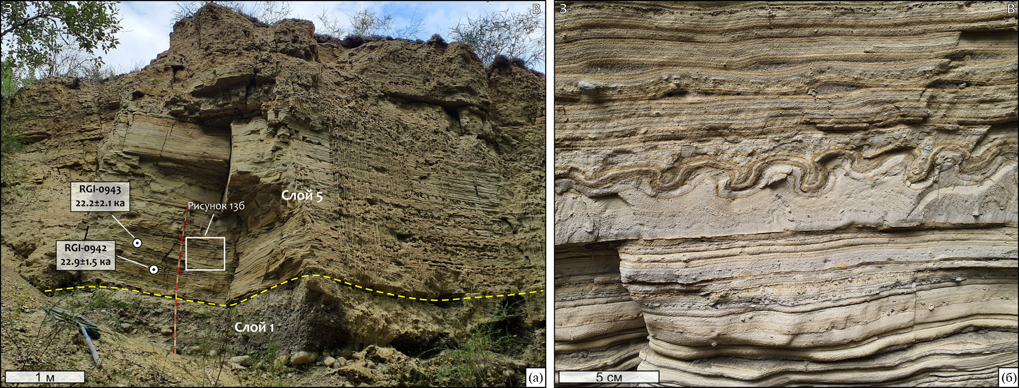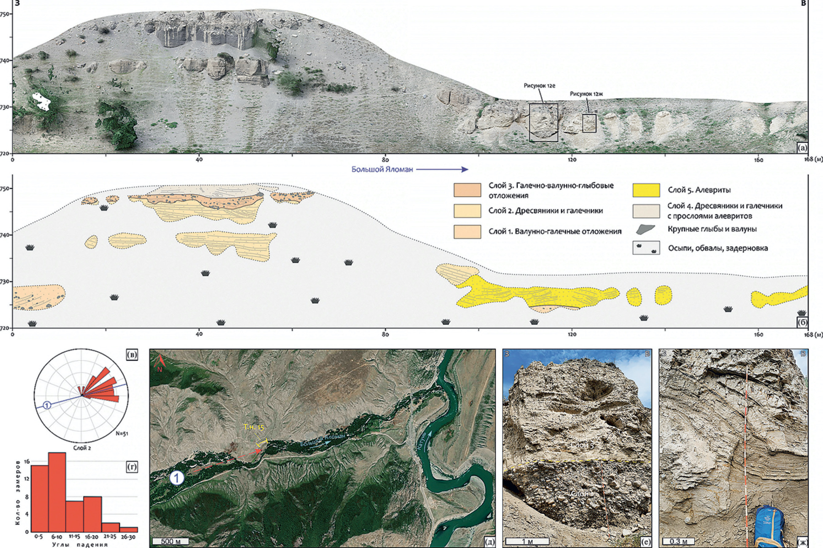 Примечательно, что мощности отложений максимальны в центральной части обнажения и приурочены к оси боковой долины временного водотока, тогда как на флангах разреза мощности уменьшаются (рис. 2б, 2е). Направления падения слоистости слоев 2 и 3 преимущественно ЗЮЗ (230°–270°), противоположные направлению течения р. Б. Яломан, со средними углами падения 10°–20°, редко до 30°–35° (рис. 2в–2д).
