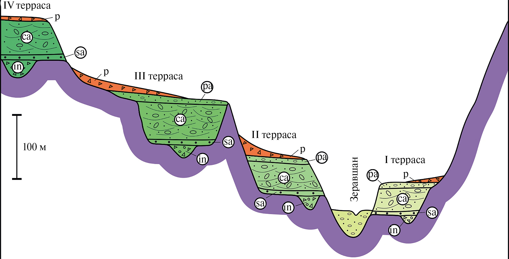 А – селевая фация, представленная грубообломочным неокатанным песчано-щебнисто-глыбовым неслоистым материалом; cчитается, что она формируется в начале катастрофического паводка при прохождении селя, который захватывает коллювиальные образования (включая крупные глыбы) с бортов долин;