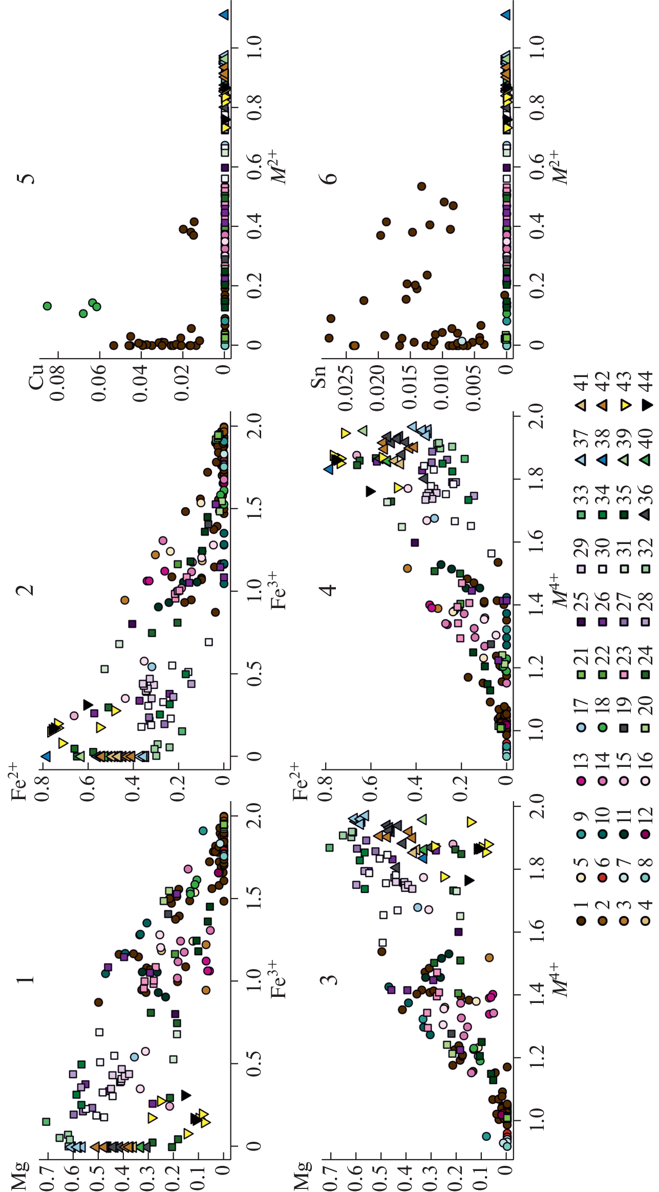 For the first time there is characterized pseudobrookite from deposits of active volcanic fumaroles Arsenatnaya and Yadovitaya of the Tolbachik volcanic massif (Kamchatka). Chemical composition of pseudobrookite-group minerals and isomorphism in these oxides of different origin were studied on the base of 203 analyses (literature data and original analyses of 40 samples) from 44 localities. It is shown that at the near-surface levels pseudobrookite crystallized mainly with composition chemically close to the end-member Fe\(_{2}^{{3 + }}\)TiO5. It is known that lunar rocks contain only minerals of the “ferropseudobrookite” Fe2+Ti2O5 ‒ armalcolite MgTi2O5 series characterized by an intermediate value of the Fe2+:Mg-ratio, the highest Ti content and the absence of Fe3+. Impact minerals and there technogenic analogues are chemically close to Fe2+Ti2O5. Pseudobrookite from Tolbachik fumaroles is characterized by the high Al content (up to 7.1 wt % Al2O3), a stable level of Cu (up to 1.8 wt % CuO) and Sn (up to 1.8 wt % SnO2) admixtures, and, sporadically by the small admixture of Sc (up to 0.3 wt % Sc2O3). Cu and Sn admixtures are indicative features of the pseudobrookite of this genetic type. These elements usually are incorporated into pseudobrookite together, according to the isomorphic scheme Sn4+ + Cu2+ → 2Fe3+, which is revealed for the first time for minerals of this group. Pseudobrookite of Tolbachik fumaroles was formed participating the process of gas–metasomatic alteration of basalt at temperature 500–750 °С. Presumably, Cu and Sn were brought by volcanic gas, while basalt was a source of Ti, Al and Sc; for Fe a source could be mixed.