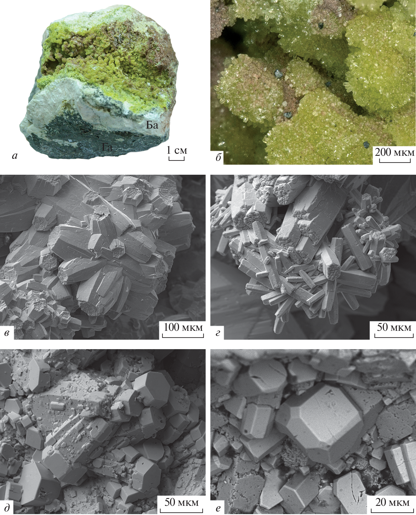The paper describes Ca-Pb phosphates—pyromorphite and phosphohediphane from the oxidation zone of barite-lead (calcite-barite-galena) ores of the Ushkatyn-III deposit in Central Kazakhstan. Both minerals occur equally frequently within the deposit. Lead phosphates coexist with minerals as almost unaffected by surface changes in ores (galena, pyrite, barite, calcite, rhodochrosite, chamosite, and others), so with minerals of highly oxidized ores (cerussite, montmorillonite, kaolinite, goethite, and others). As the processes of supergene processes develop (during the transition from weakly to strongly oxidized ores), the compositions of newly formed phosphates change regularly in the following consequence: phosphohedifane → rhythmically zonal Ca-Pb phosphate → pyromorphite. At the same time, the habit (and appearance) of mineral crystals changes from dipyramidal-prismatic through elongated prismatic (barrel-shaped) to pinacoidal-prismatic (short-columnar). Crystallization of pyromorphite is possible already at very low concentrations of lead, phosphorus and chlorine in solution. The main source of chlorine is groundwater, and phosphorus is coming from the organic matter of the soil cover overlying ore-bearing deposits. Peculiarities of the chemical composition and crystal structure of Ca-Pb phosphates, as well as the nature of their mineral associations, suggest the presence of a discontinuity in isomorphic miscibility in the series pyrofmorphite–phosphohedifane and phosphohedifane–chlorapatite.