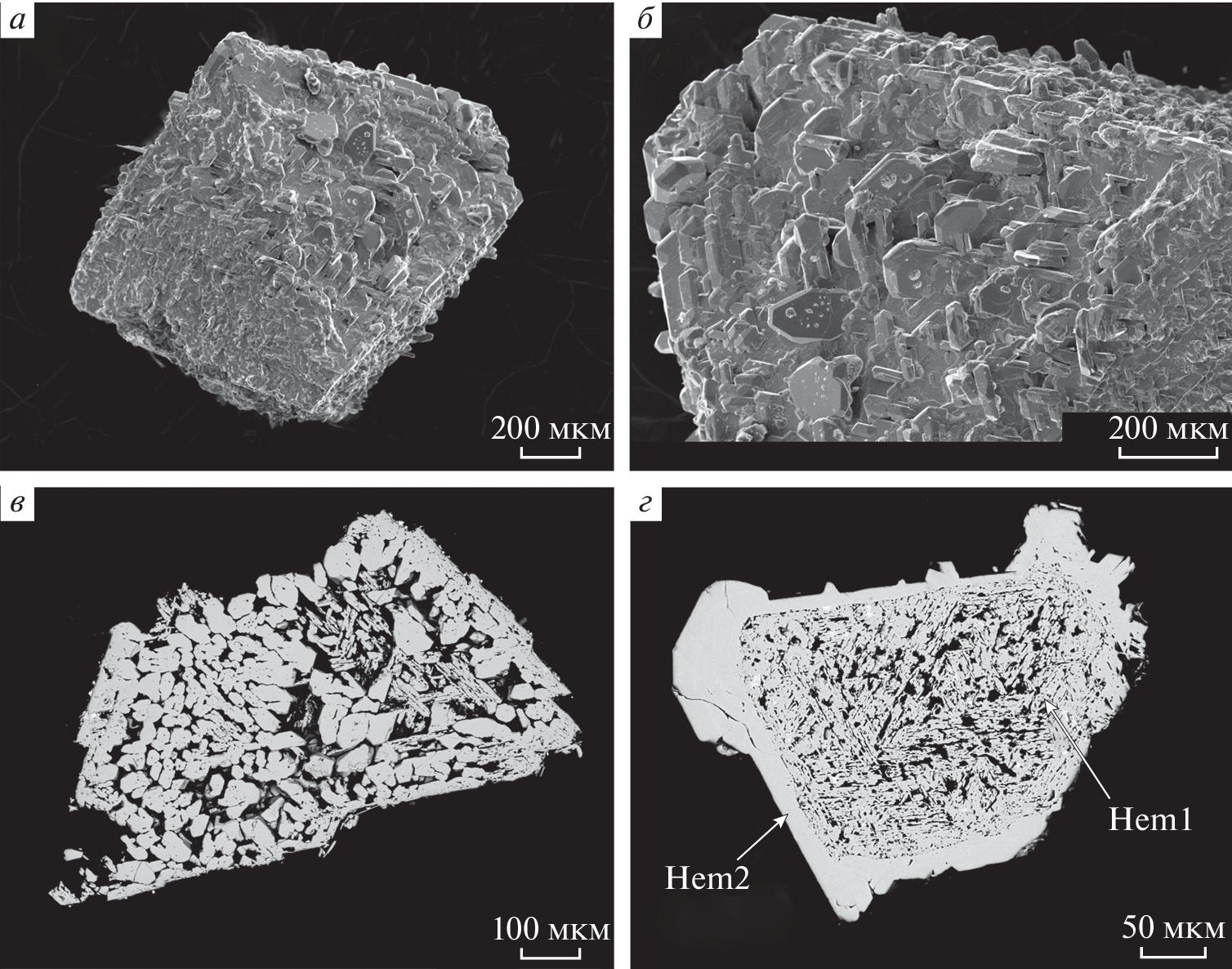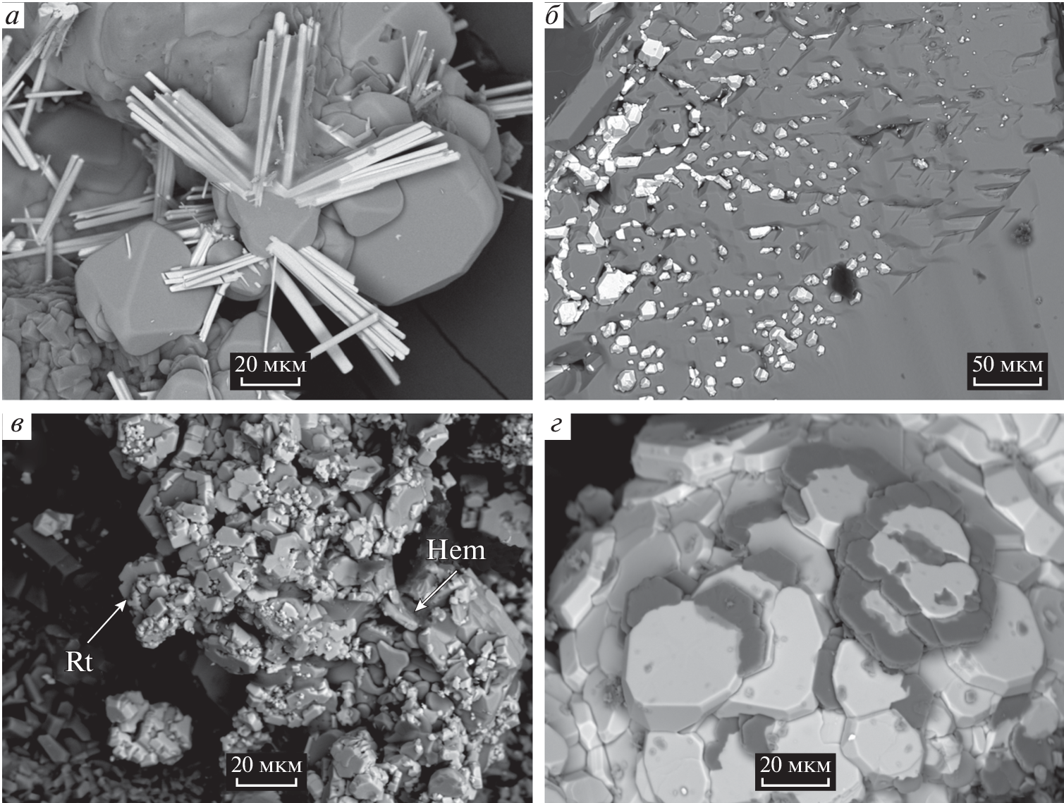Hematite from fumaroles of the Tolbachik volcano (Kamchatka, Russia) was studied in detail. There is characterized epitaxy of rutile-group minerals (cassiterite, rutile, and tripuhyite), oxide spinels (magnesioferrite, gahnite, and cuprospinel), and corundum on hematite. Fumarolic hematite contains significant admixtures of chalcophile elements: tin (up to 9.2 wt % SnO2, the highest content known for natural hematite), copper (up to 4.7 wt % CuO), and antimony (up to 2.6 wt % Sb2O5) – which is a novel for this mineral. Other significant admixtures are represented by Ti, Mg, Mn, Al, and Cr. There were revealed previously unknown Sn-Cu- and Sn-Cu-Sb-bearing varieties of hematite and new for this mineral isomorphic schemes: Sn4+ + Cu2+ → 2Fe3+ and Sb5+ + 2(Cu,Fe)2+ → 3Fe3+. It is shown that in oxidizing-type fumaroles of Tolbachik hematite is the major concentrator of Sn and Sb. Hematite enriched in such admixtures was formed in the temperature range of 500–850 °C. Volcanic gas was the source of chalcophile elements (Sn, Sb, Cu, Zn), whereas a source of hardly volatile components (Mg, Al, Cr, Ti) was basalt surrounding fumarole chambers; a mixed source is suggested for Fe, Mn and V. The chalcophile specificity of admixed components is an indicative feature of fumarolic hematite. The finding of martite in Tolbachik fumaroles implies that the oxidizing potential increases in time during the fumarolic mineral formation.