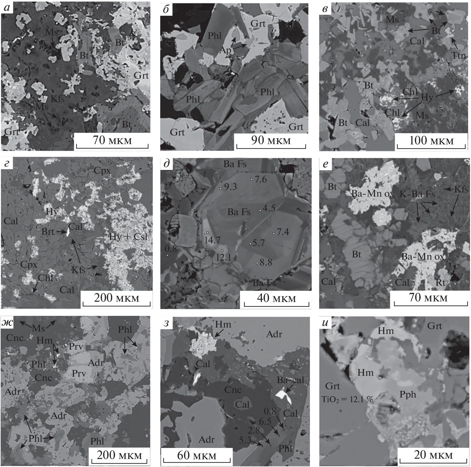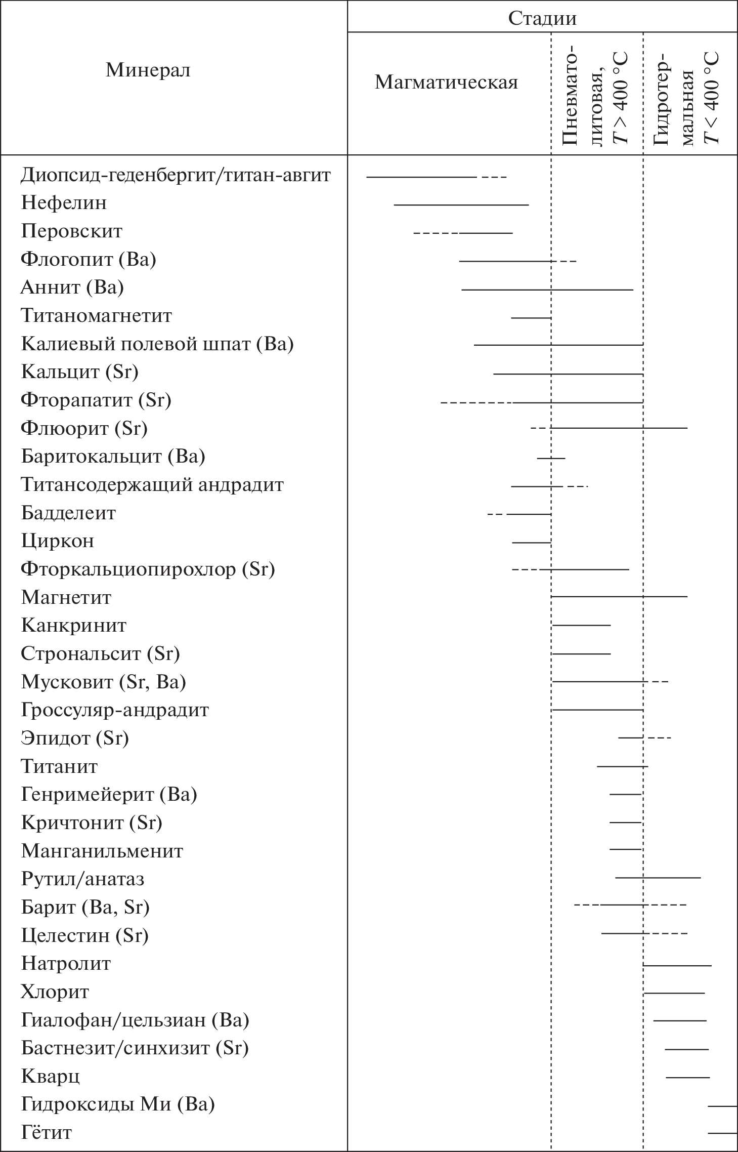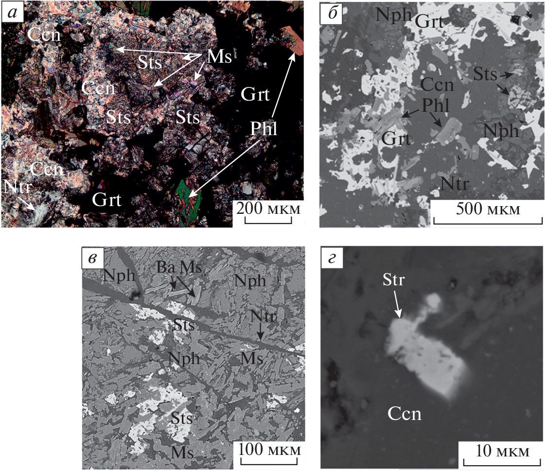 The paper displays data on Sr- and Ba-bearing minerals occurring in melteigite, ijolite, urtite, and nepheline syenite of the Bolshetagninsky ijolite-syenite-carbonatite massif. At the magmatic stage, strontium enters as an isomorphic admixture into calcite (SrO = 0.5–1.9 wt %) and fluorapatite (SrO = 0.6–2.6 wt %), while barium mainly enters in phlogopite and annite. Zonal phlogopite in urtite contains up to 8.4 wt % BaO (24 mol. % of kinoshitalite component); interstitial calcite in the same rock contains small ingrowths of barytocalcite. Stronalsite, strontianite, crichtonite, henrimeyerite, barite, celestite, Sr-bearing fluorcalcipyrochlore, Sr-bearing muscovite, and epidote have crystallized at the high-temperature postmagmatic stage. In the exocontact zone of the carbonatite stock, ijolite and nepheline syenite underwent biotitization, carbonatization, and K-feldspathization, followed by chloritization and formation, in some spots, of hyalophane and celsian segregations and veinlets. The formation of Ba-bearing muscovite and Ba-bearing manganese hydroxides took also place at the low-temperature hydrothermal stage. The presence of hyalophane and celsian in altered alkaline rocks is a peculiarity of the Bolshetagninsky massif, indicating the low activity of \({\text{SO}}_{4}^{{2 - }}\) in hydrothermal solutions.