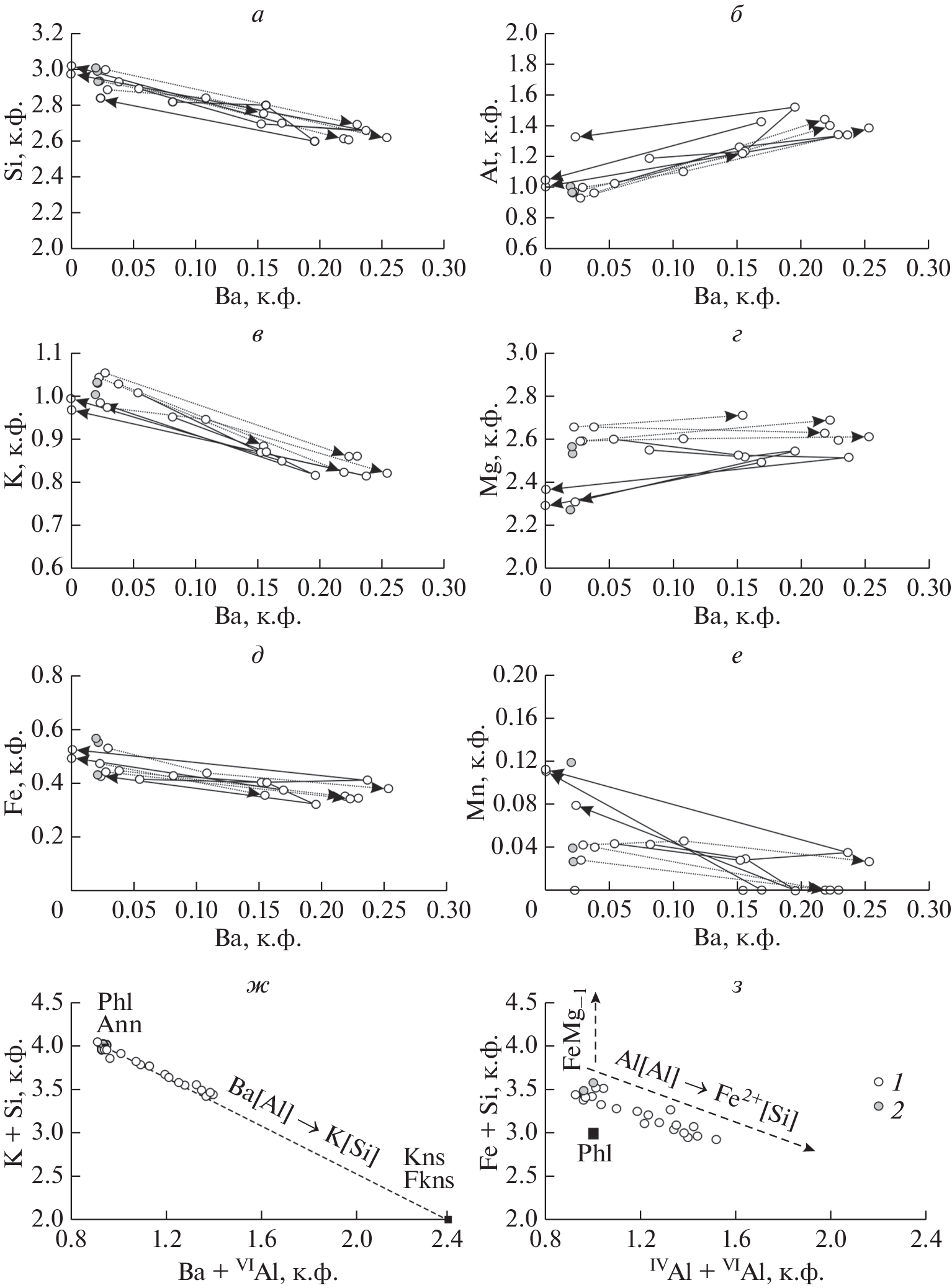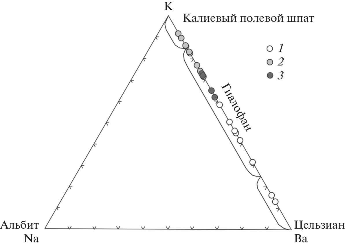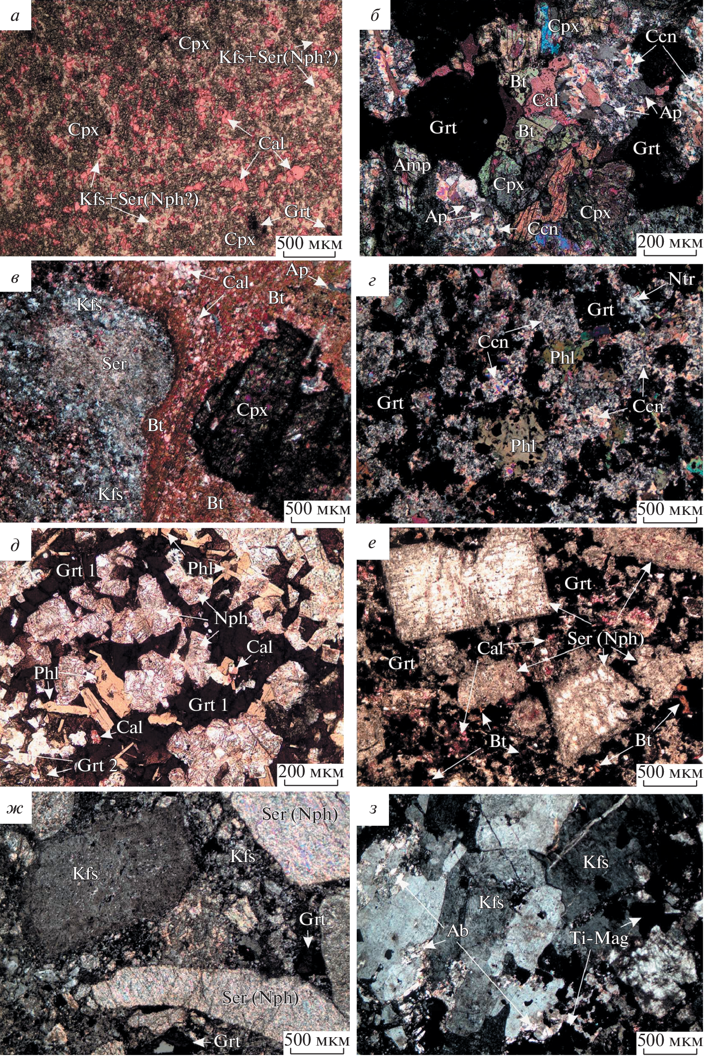 The paper displays data on Sr- and Ba-bearing minerals occurring in melteigite, ijolite, urtite, and nepheline syenite of the Bolshetagninsky ijolite-syenite-carbonatite massif. At the magmatic stage, strontium enters as an isomorphic admixture into calcite (SrO = 0.5–1.9 wt %) and fluorapatite (SrO = 0.6–2.6 wt %), while barium mainly enters in phlogopite and annite. Zonal phlogopite in urtite contains up to 8.4 wt % BaO (24 mol. % of kinoshitalite component); interstitial calcite in the same rock contains small ingrowths of barytocalcite. Stronalsite, strontianite, crichtonite, henrimeyerite, barite, celestite, Sr-bearing fluorcalcipyrochlore, Sr-bearing muscovite, and epidote have crystallized at the high-temperature postmagmatic stage. In the exocontact zone of the carbonatite stock, ijolite and nepheline syenite underwent biotitization, carbonatization, and K-feldspathization, followed by chloritization and formation, in some spots, of hyalophane and celsian segregations and veinlets. The formation of Ba-bearing muscovite and Ba-bearing manganese hydroxides took also place at the low-temperature hydrothermal stage. The presence of hyalophane and celsian in altered alkaline rocks is a peculiarity of the Bolshetagninsky massif, indicating the low activity of \({\text{SO}}_{4}^{{2 - }}\) in hydrothermal solutions.