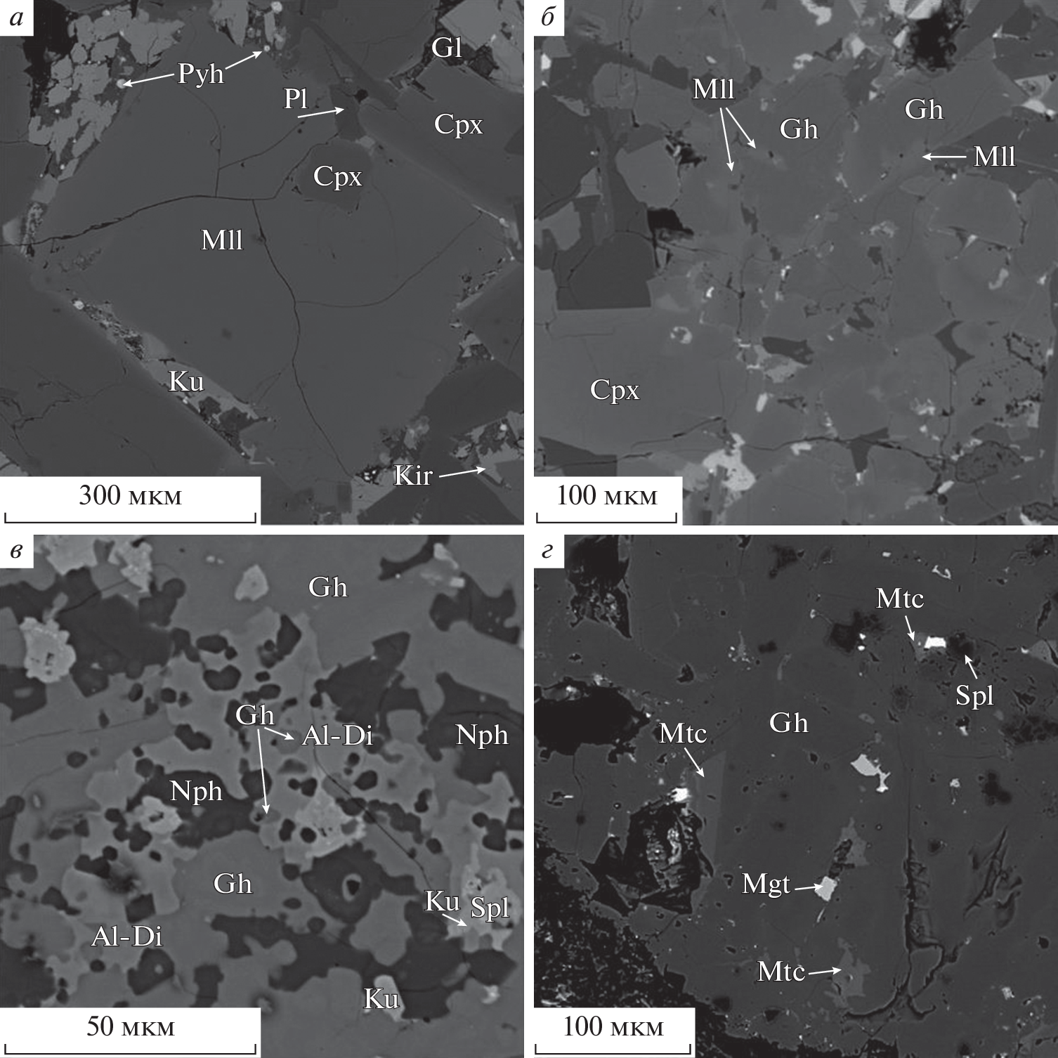 Paralavas of combustion metamorphic complexes in Mongolia were formed in high-temperature conditions from carbonate-terrigenous rocks of sedimentary formations due to to multistage spontaneous underground coal fires. Melilite-nepheline paralavas contain phenocrysts of Fe-rich åkermanite-alumoåkermanite, clinopyroxene of the diopside–hedenbergite series containing up to 49 mol. % of kushiorite end-member, and basic plagioclase. Enstatite-ferrosilite is the rock-forming mineral in paralavas of the plagioclase-pyroxene ± ± indialite composition. Paralavas often contain xenoliths of thermally altered sedimentary rocks. Mineral associations in remnant xenoliths of marly limestone are composed of gehlenite, minerals of the monticellite–kirschsteinite series, perovskite, Al-rich clinopyroxene, spinel, and other minerals. They were formed both at the stage of the high-temperature metamorphism of sedimentary protolite, preceding the melting of carbonate-silicate rocks, and as a result of the reactionary interaction between xenoliths and pyrogenic silicate melts of different composition.