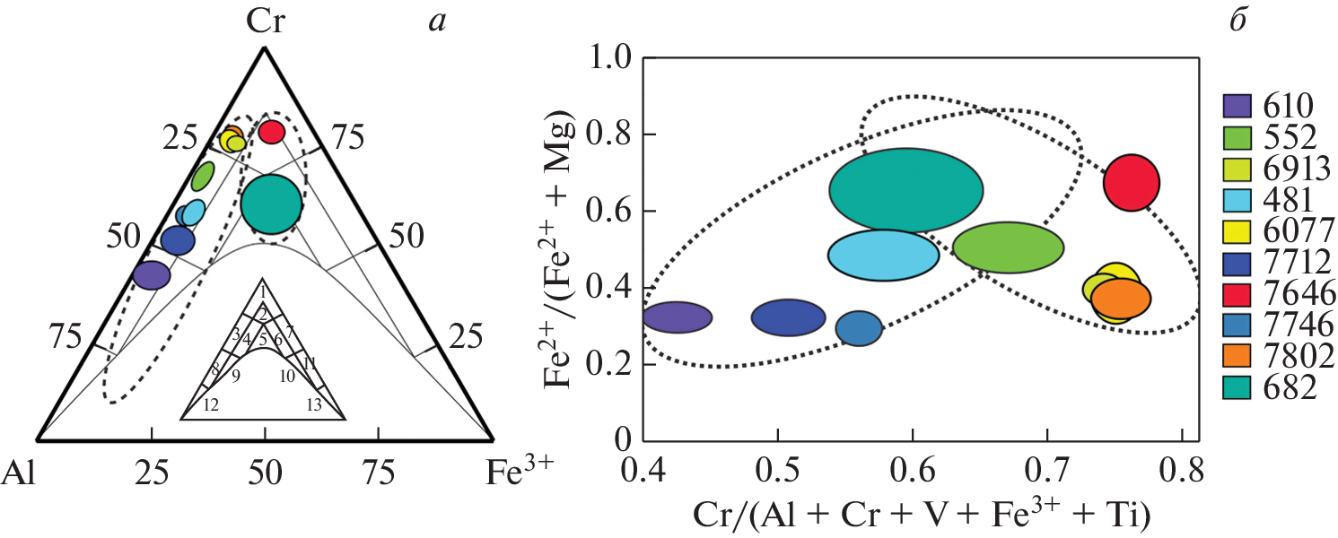 The oxidation state of Fe, Cu, Eu, Ce, etc. in minerals is an important indicator of redox conditions for their formation and evolution. In this work, the features of X-ray emission Fe Lα,β spectra (XES) obtained by Cameca SX100 microprobe, as well as the Mössbauer spectra of Cr-spinels of various compositions from a number of the Urals ultramafic massifs, have been studied. Using microprobe data on the composition and homogeneity of the grains, as well as the Fe3+/\({\text{Fe}}_{{{\text{tot}}}}^{{{\text{M\"o ssb}}}},\) 19 intralaboratory reference samples have been selected from a large number of the Urals Cr-spinels. Based on the analysis of BSE images and maps of the distribution of elements in Cr-spinel grains, the most homogeneous ones were identified. It was shown that, up to the determination error, Fe3+/\({\text{Fe}}_{{{\text{tot}}}}^{{{\text{M\"o ssb}}}}\) coincides with that obtained in the framework for calculation approach based on microprobe data on the composition and assumptions about the mineral stoichiometry. For determination of Fe oxidation state by XES data, it has been proposed to use as a calibration dependence for intralaboratory reference samples the position of the maximum of Fe Lα line on the content of Fe2+; the latter is satisfactorily approximated by a linear function (rxy = 0.96); the relative error of Fe2+ determination is 2%. Approbation of the developed approach was carried out on a series of control samples of Cr-spinels; the obtained values of Fe2+ and Fe3+/Fetot agree satisfactorily with the Mössbauer and calculated data in the stoichiometric approximation.