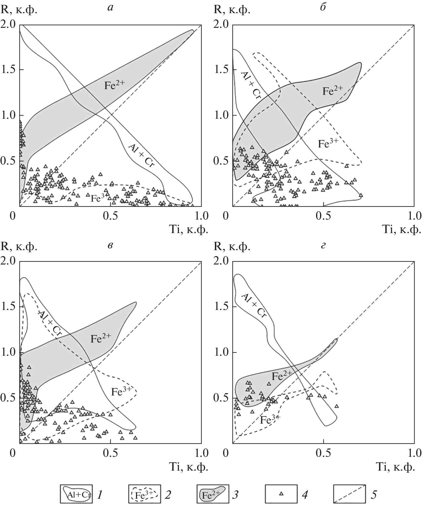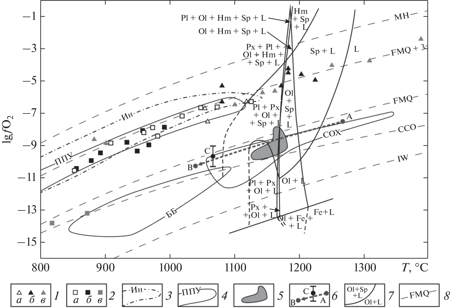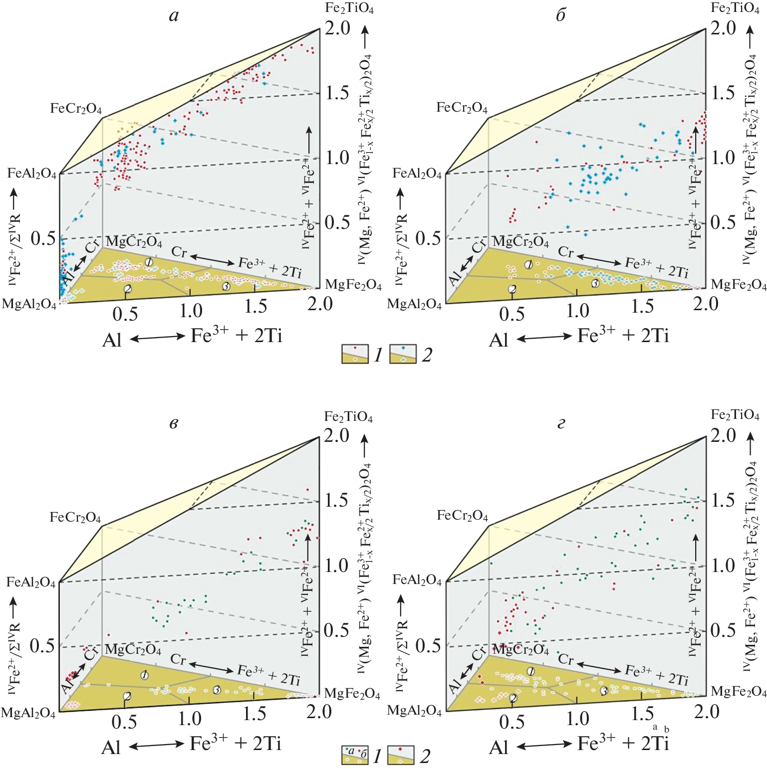The typochemical features of spinels forming continuous series from Al–Cr spinels to Ti-magnetite and ulvöshpinel from basic-ultrabasic rocks of the North Siberian platform are considered. Their comparative characteristics are carried out with similar minerals of alkaline basalts of oceanic islands and Lunar marine basalts on the modified 3D-diagram Al–Cr–(Fe3+ + 2Ti)–Fe2+ proposed by the author. The identification of a continuous isomorphous series from chromian spinel to ulvöspinel is one of the mineralogical indicators of a possible paragenetic relationship between picrite-basalt, alkaline olivine-basalt, alkaline-ultrabasic, and kimberlite formations in the North Siberian platform. Using the Ballhaus-Berry-Green olivine-chromespinel oxythermobarometer, it was shown that for the studied rocks of the North Siberian platform, the oxygen volatility lg fO2 is 2–4 orders of magnitude higher than that specified by the fayalite-magnetite-quartz (FMQ) buffer and corresponds to the oxidation state of platinum-bearing dunite-clinopyroxenite associations of rocks of the Ural-Alaskan and Aldan types.