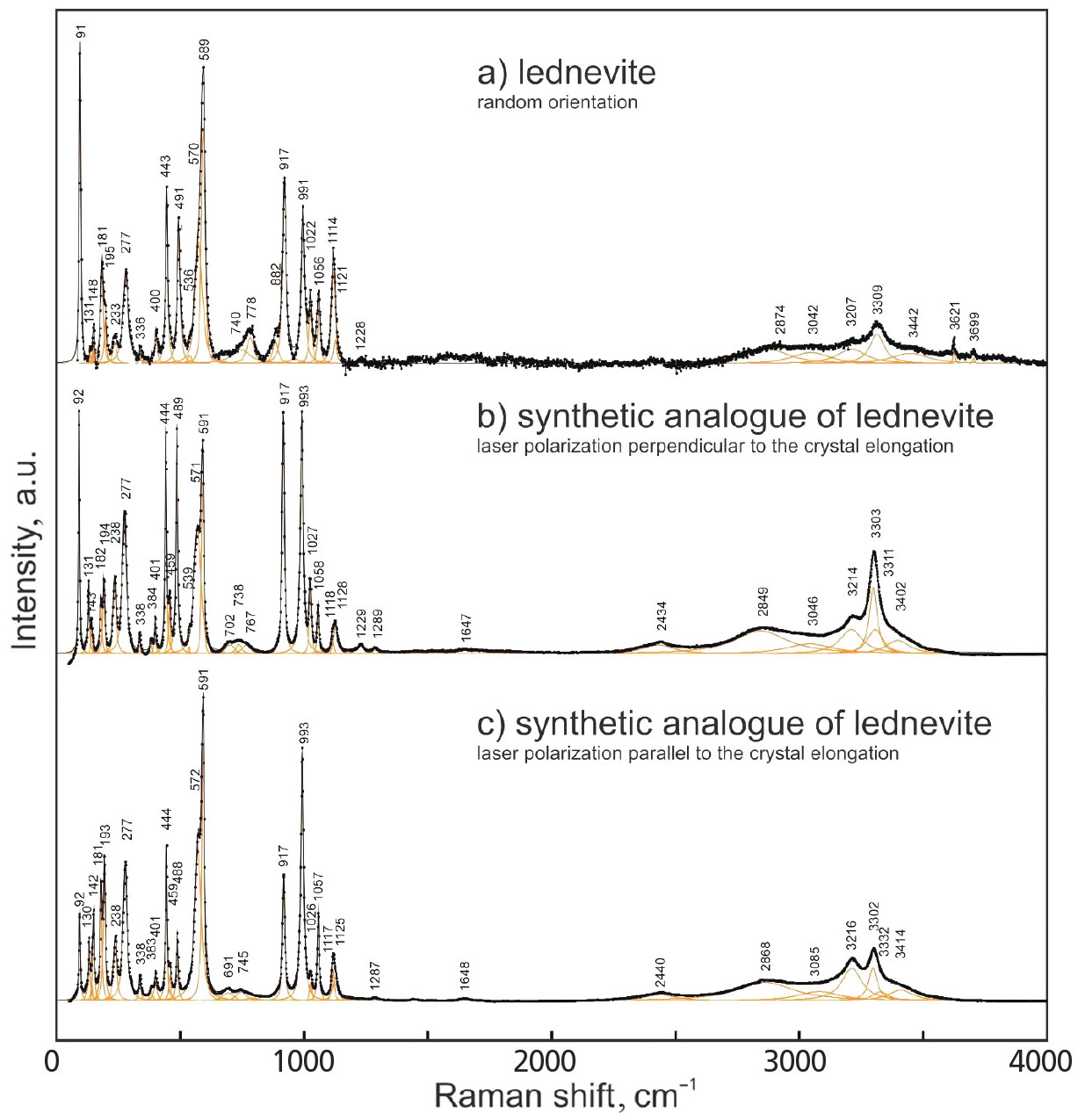 Рис. 6. КР-спектры a) ледневита и b), c) его синтетического аналога, полученные при возбуждающем лазерном излучении с длиной волны 532 нм в диапазоне 50–4000 см–1. Измеренный спектр показан точками. Аппроксимирующая его кривая, полученная как суперпозиция индивидуальных фойгтовских пиков, показана под экспериментальной кривой. Спектры (b) и (c) получены при лазерном излучении, поляризованном перпендикулярно и параллельно удлинению кристалла соответственно.
