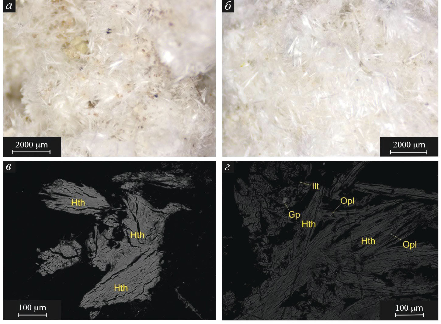2. Fig. 1. White acicular crystals of halotrichite from thermal field of the Bolshoi Semiachik volcano (a, б) and SEM (BSE mode) images of halotrichite: (в) fibrous aggregates of halotrichite (Hth), (г) halotrichite in association with opal (Opl), gypsum (Gp) and illite (Ilt).