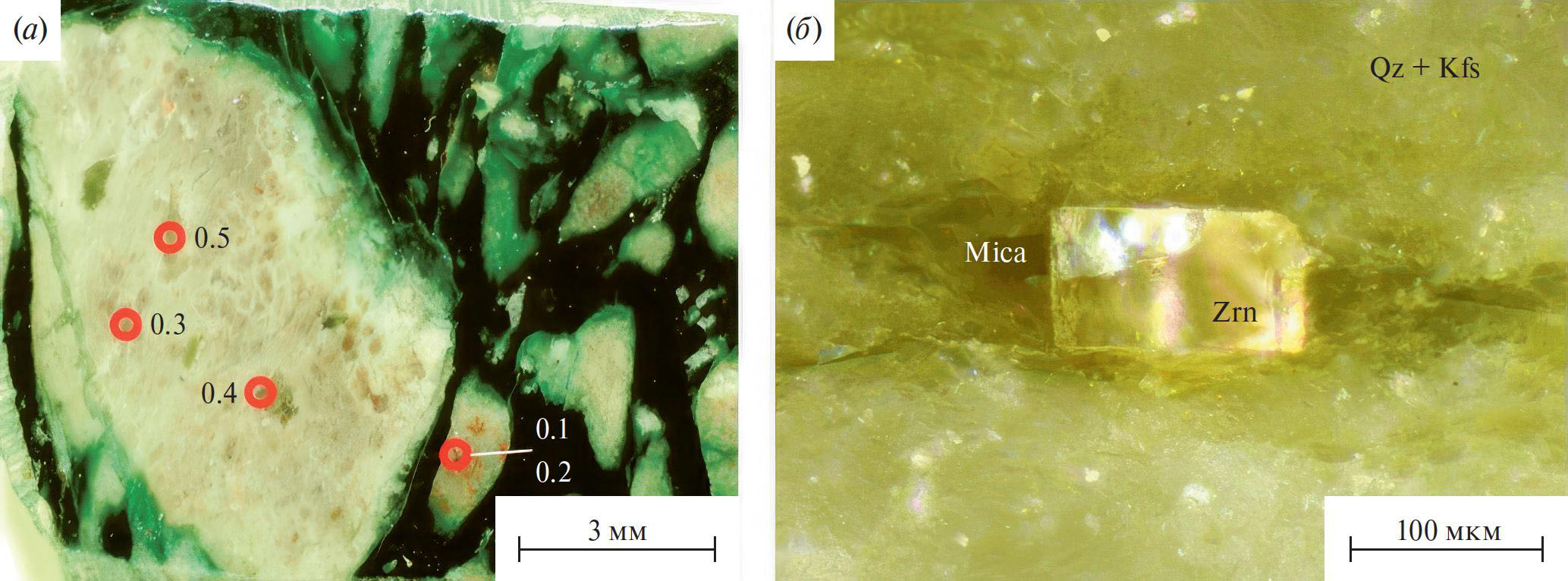 Рис. 3. Метариолитовая брекчия с фукситовым цементом с указанием положения кристаллов циркона, использованных для геохронологических исследований, результаты которых показаны на рисунке 6 (а); микрофотография кристалла циркона, приуроченного к обогащённому слюдой участку в метариолите, отраженный свет с анализатором (б). Mica — слюда, Qz — кварц, Kfs — калиевый полевой шпат, Zrn — циркон.