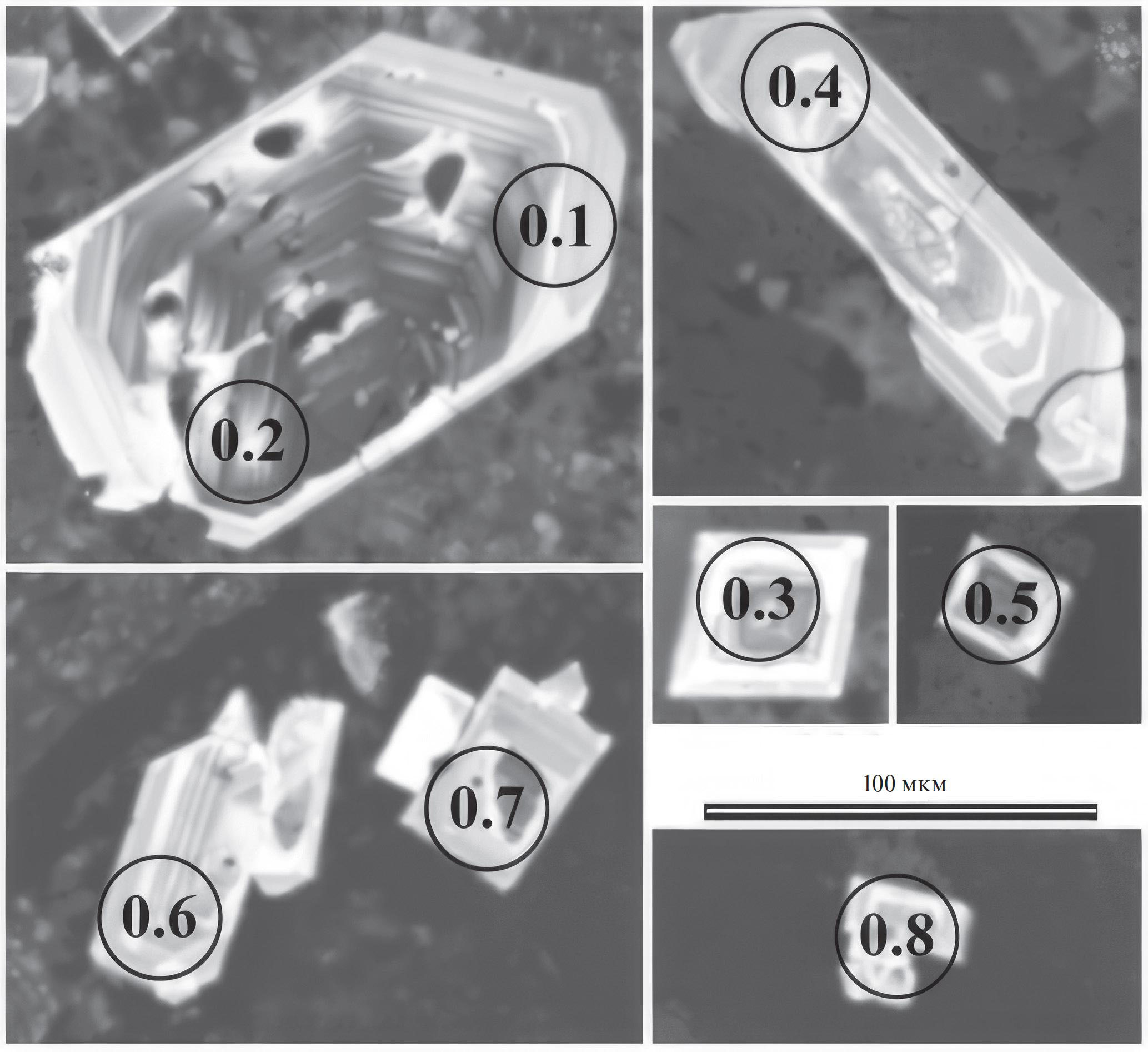 Изотопно-геохронологические исследования циркона. Изучение кристаллов циркона, вскрытых непосредственно в аншлифах, проведено в двух образцах. Первый образец представлен золотоносной метариолитовой брекчией с фукситовым цементом. Индивиды циркона находились во фрагментах метариолитов, где были локализованы в участках, обогащенных фенгитом (рис. 3, точки анализа 0.1—0.5 на рис. 5). Кристаллы циркона во втором образце приурочены к локальному скоплению титансодержащих минералов, расположенному в массивном фукситовом агрегате (рис. 4; аналитические точки 0.6—0.8 на рис. 5).