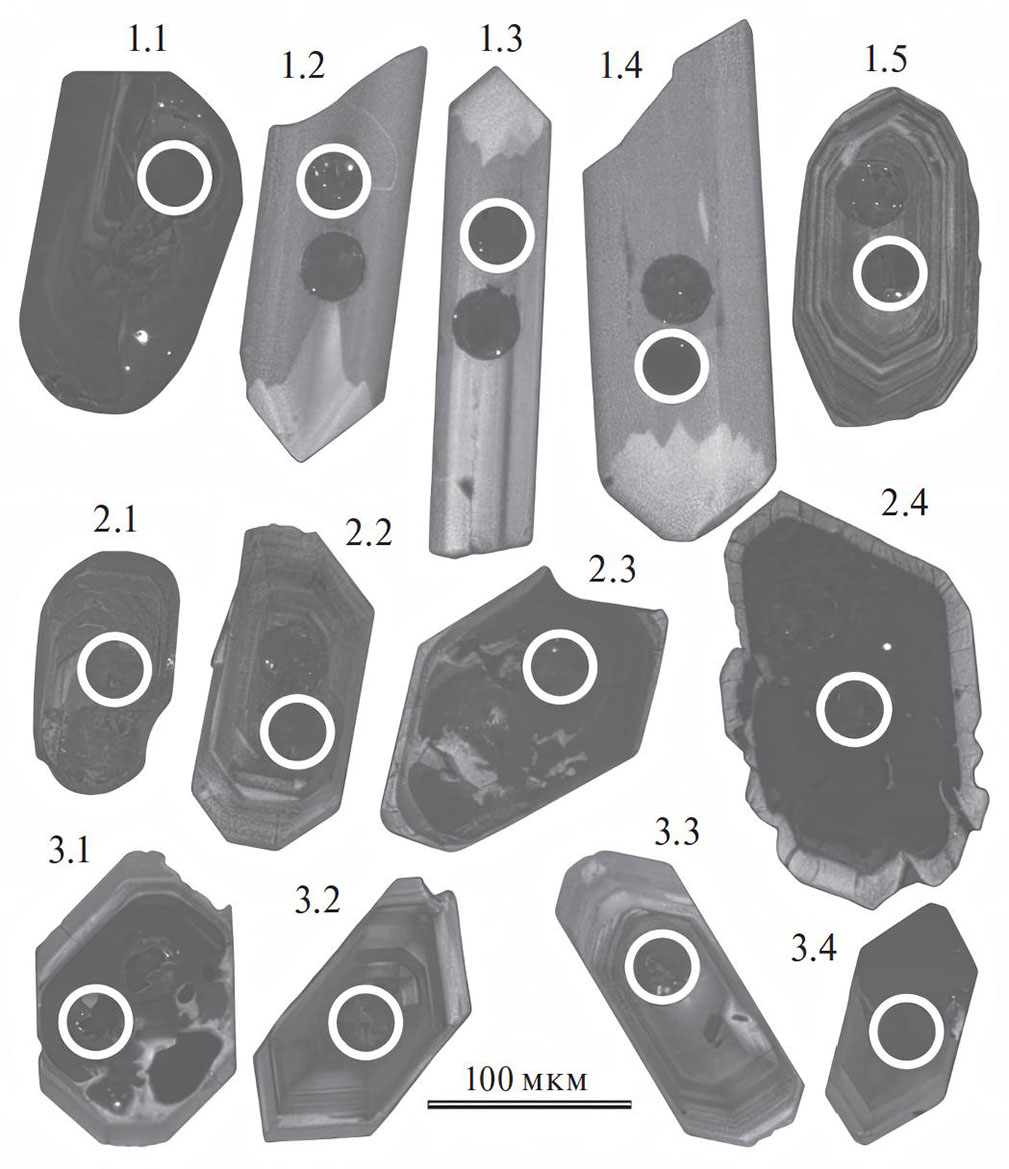 Рис. 7. Катодолюминесцентные микрофотографии изученных зерен циркона из мономинеральных проб. Кругами отмечено положение аналитических кратеров (диаметр 25 мкм).