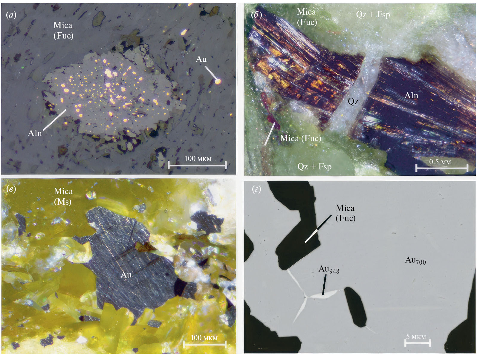 Рис. 10. Взаимоотношение золота с алланитом и мусковитом (фенгитом): а — агрегат алланита с обильным тонким золотом в фуксите (отраженный свет без анализатора); б — стерильный в отношении золота сноповидный агрегат алланита поздней генерации, рассеченный кварцевым прожилком (отраженный свет с анализатором); в — выделение золота среди идиоморфных кристаллов железистого мусковита (фенгита) (отраженный свет с анализатором); г — высокопробное золото на границах зерен его более низкопробной разновидности (изображение в обратно-отраженных электронах). Aln — алланит, Au — золото, Fsp — полевой шпат, Hem — гематит, Mica (Fuc) — слюда (фуксит), Mica (Ms) — слюда (мусковит-фенгит), Qz — кварц.