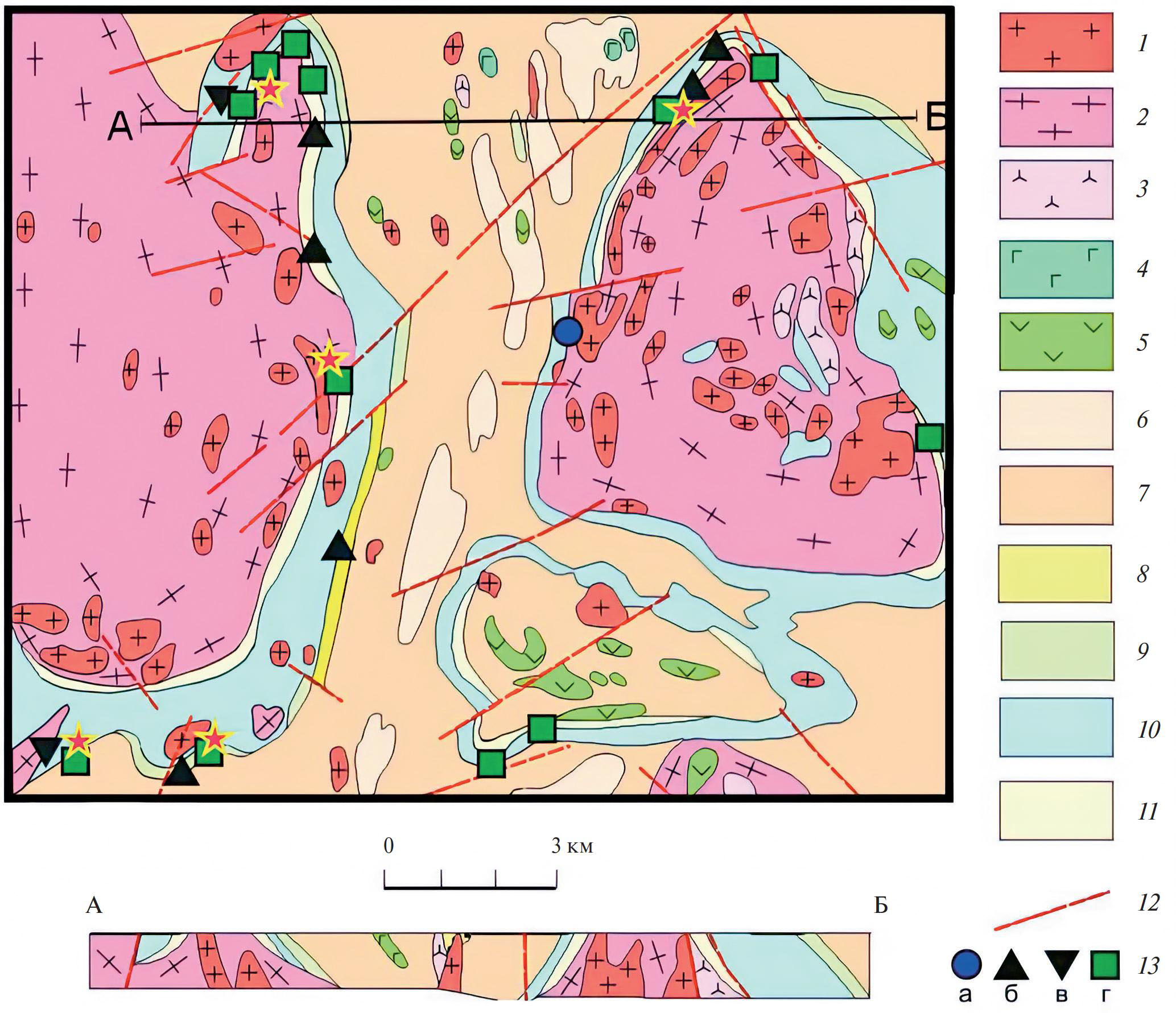 1 — посторогенные лейкограниты и пегматоидные граниты; 2 — гнейсограниты, мигматиты, гнейсы (реоморфизованный архейский фундамент); 3, 4 — раннеорогенные интрузии: 3 — плагиограниты, тоналиты, 4 — габброиды, кварцевые диориты; 5 — диабазы, габбродиабазы, габброамфиболиты; 6, 7 — ладожская серия: 6 — кварциты, кварцитопесчаники, 7 — кварц-биотитовые сланцы, гнейсосланцы и мигматиты по ним; 8—11 — сортавальская серия: 8 — апоскарновые кварцевые метасоматиты верхнего карбонатного горизонта, 9 — преобразованные магнезиальные, местами апомагнезиальные известковые скарны (верхний карбонатный горизонт), 10 — амфиболиты, амфиболовые, биотитовые и графитистые сланцы с прослоями скарнированных карбонатных пород, апоалюмосиликатных скарнов и скарноидов, 11 — апомагнезиальные известковые и измененные магнезиальные скарны (нижний карбонатный горизонт); 12 — тектонические нарушения; 13 — рудопроявления вольфрама и полиметаллов: а — в кварц-барит-флюоритовых жилах; б — в апомагнезиальных известковых скарнах; в — в известковых инфильтрационных скарнах и скарноидах; г — в измененных магнезиальных скарнах. Звездочками помечены места отбора проб для изучения титанита.