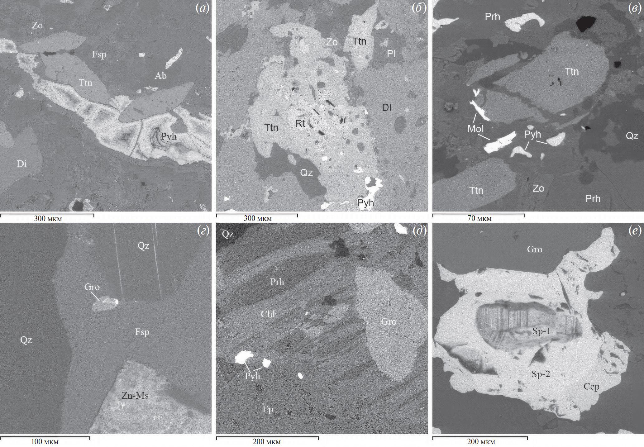 Рис. 3. Характерные формы выделения титанита (а–в) и обогащенного Al и F титанита (г–е) в измененных скарнах Латвасюрья (а–в) и Иокиранта (г–е). Изображения в обратно отраженных электронах. Ab — альбит, Ccp — халькопирит, Chl — хлорит, Di — диопсид, Ep — эпидот, Fsp — калиевый полевой шпат, Gro — обогащенный Al и F титанит, Mol — молибденит, Pl — плагиоклаз, Prh — пренит, Pyh — пирротин, Qz — кварц, Rt — рутил, Sp — сфалерит, Ttn — титанит, Zn-Ms — цинксодержащий мусковит, Zo — цоизит.