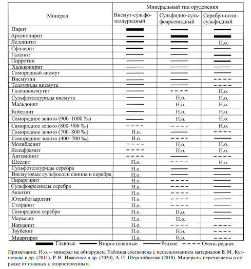 В настоящее время исследователи данный вид объектов относят к золото-порфировому (Фогельман и др., 1995; Сидоров, 2000; и др.), золото-полисульфидно-кварцевому (Константинов и др., 2000), золото-висмутовому (Горячев, Гамянин, 2006) типам.