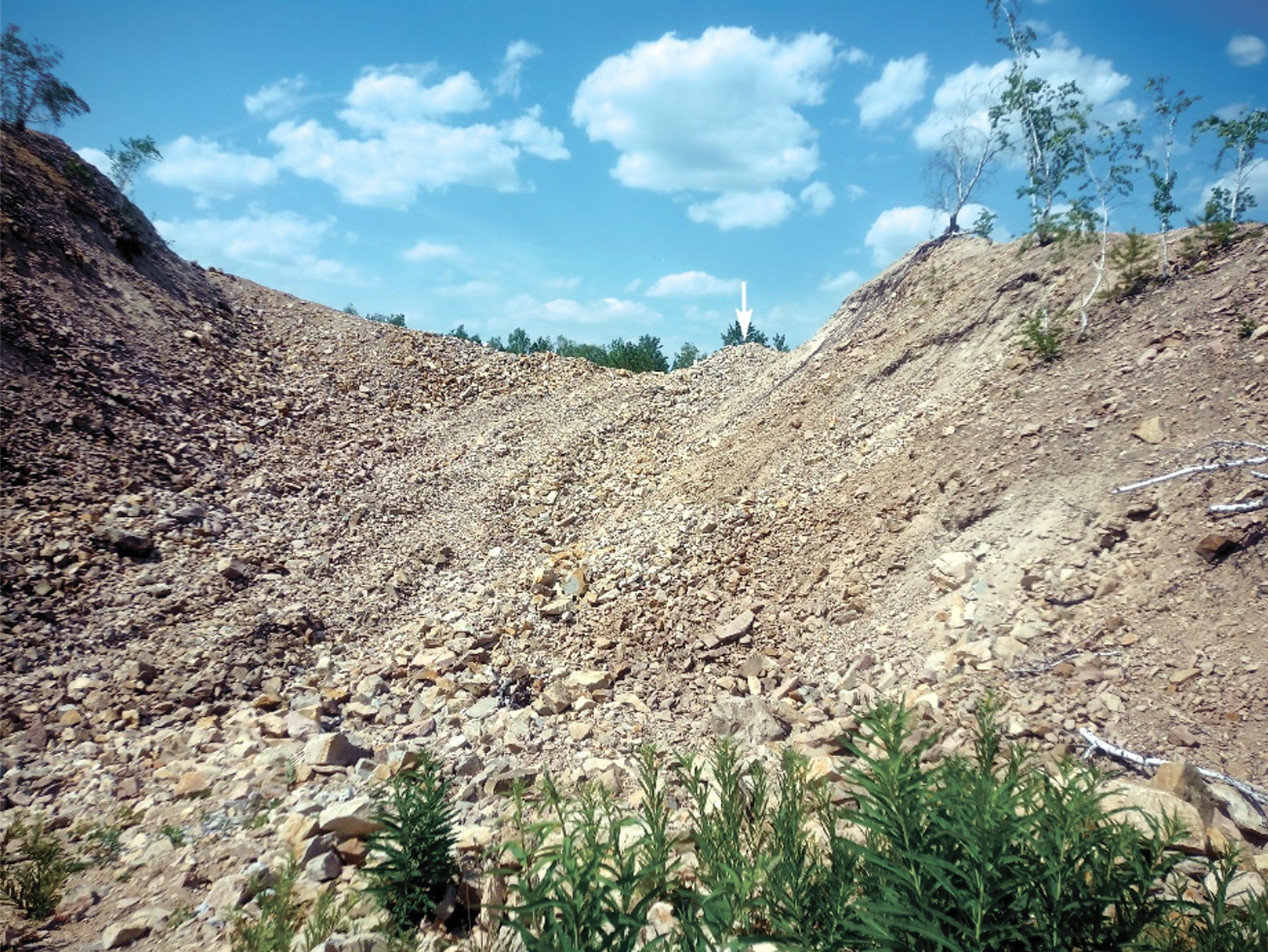 Fig. 1. Dumps of the Yugo-Konevo tungsten deposit. Place of neyite sampling is shown by an arrow. FOV ~ 15×10 m. May 2023. Photo: P. M. Andryushchenko.