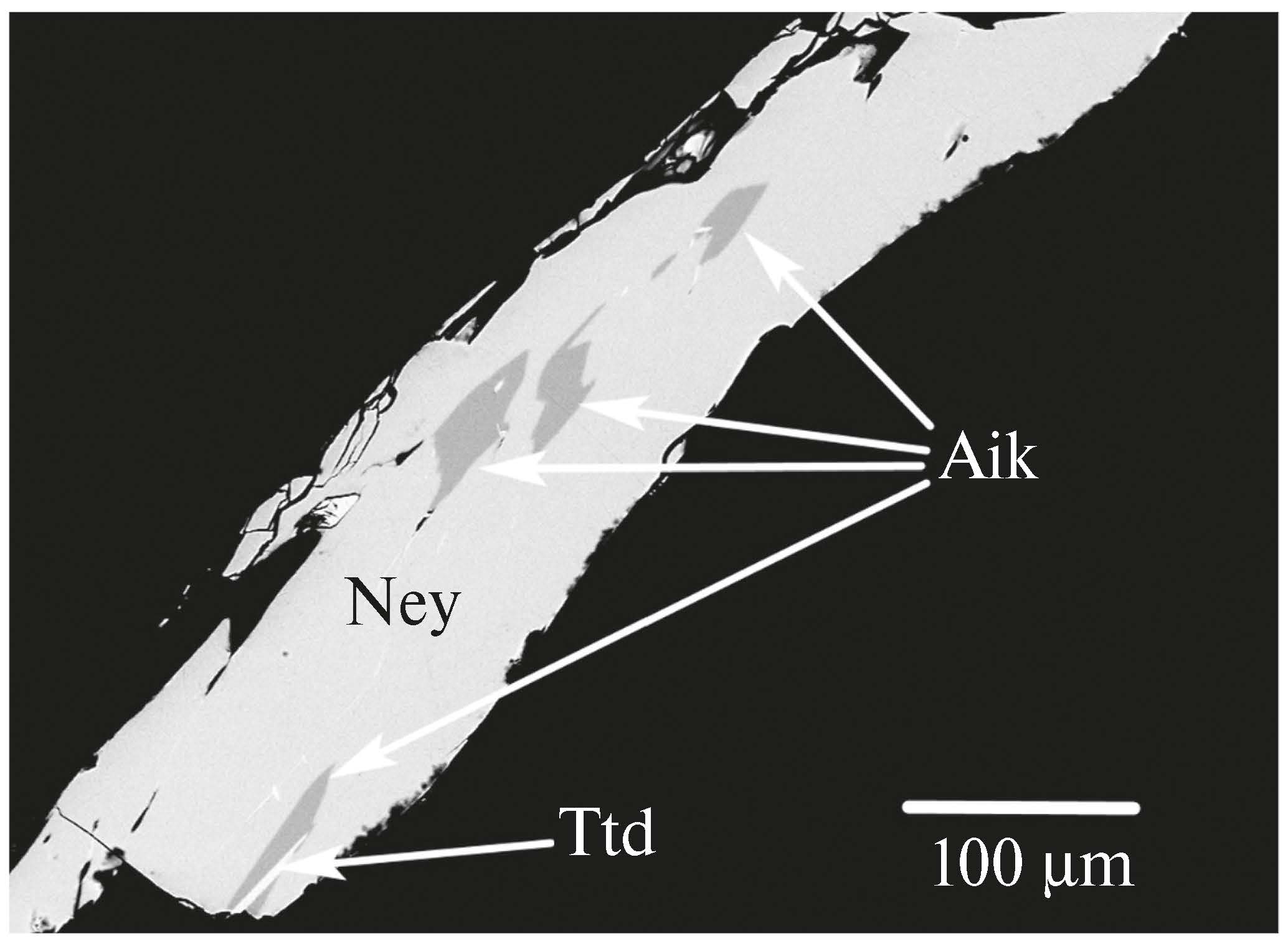 Рис. 3. Включения айкинита (Aik) и тетрадимита (Ttd) в кристалле нейита (Ney). СЭМ-изображение в отраженных электронах.