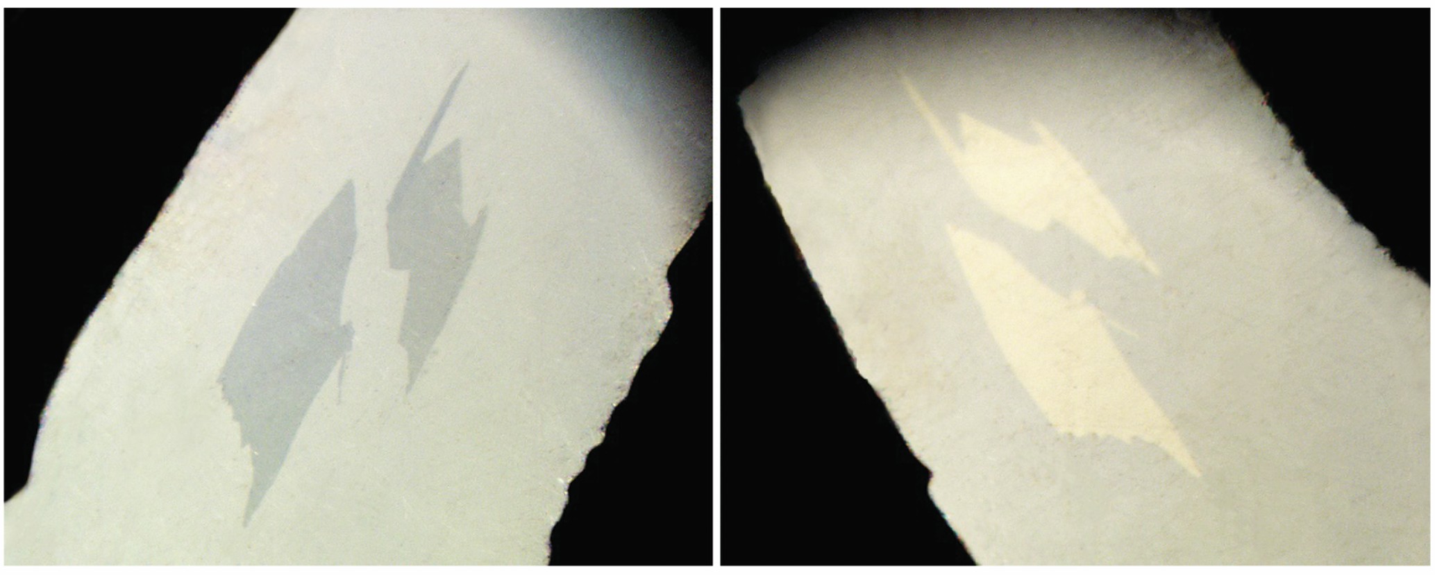Рис. 2. Нейит из Юго-Коневского вольфрамового месторождения: а — фрагмент призматического кристалла в кварце; б — фрагменты кристаллов нейита с характерной побежалостью. Фото: М. Д. Мильшина.