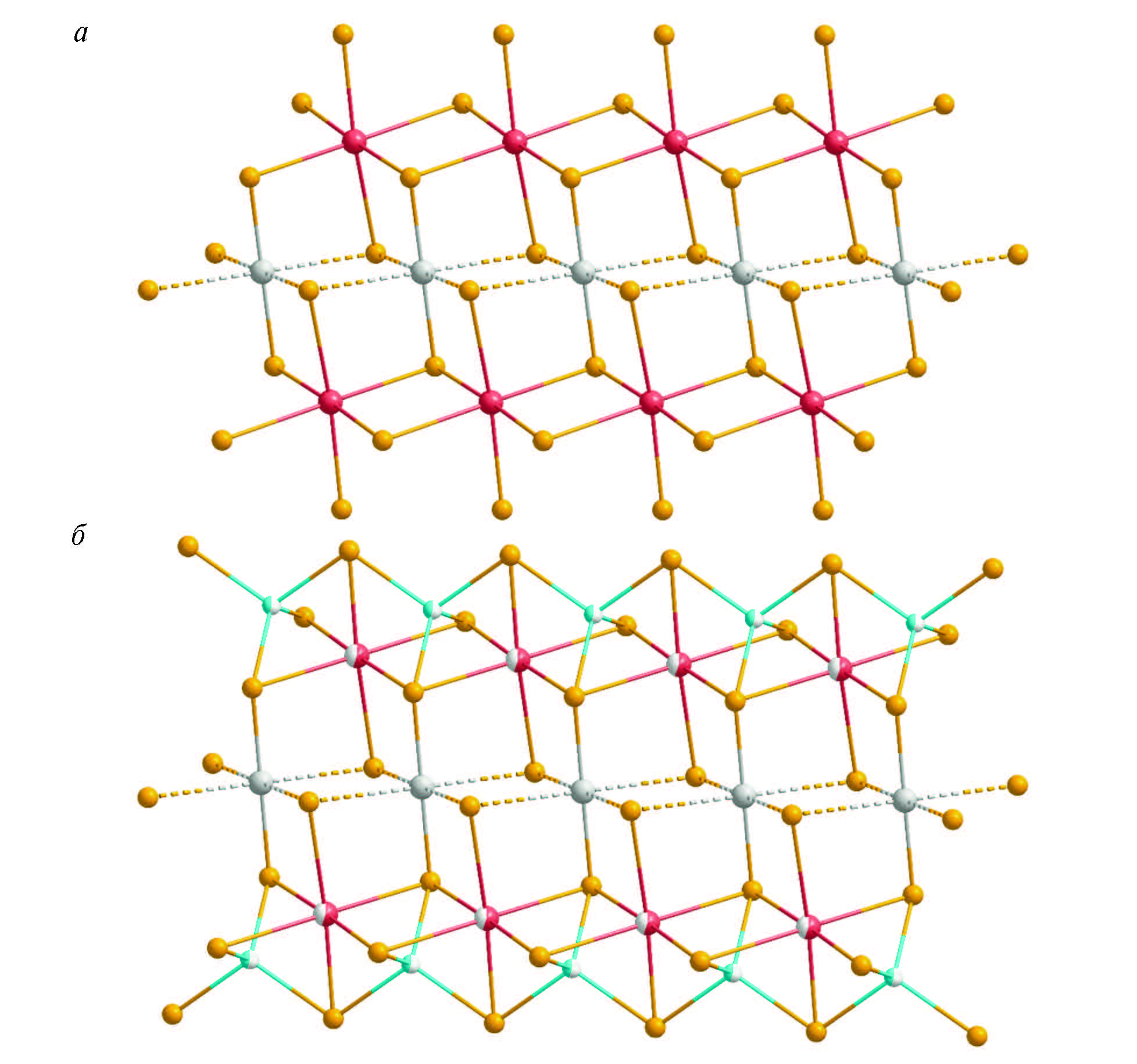 Рис. 8. Фрагменты кристаллических структур (а) нейита из месторождения Лайм Крик, Канада (Makovicky et al., 2001) и (б) нейита из Юго-Коневского месторождения, наши данные. Легенда: красный ‒ Bi3+; серый ‒ Ag+; бирюзовый ‒ Cu+; оранжевый ‒ S2–. Детали поясняются в тексте.