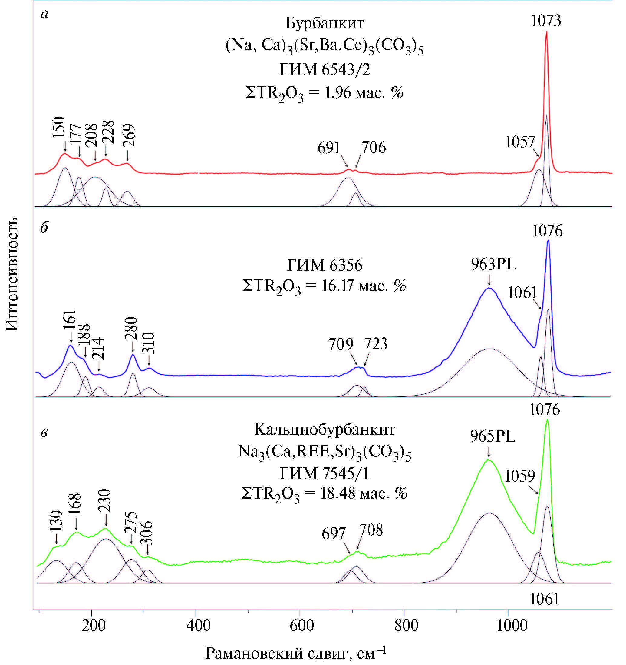 а — burbankite (GIM 6543/2); б — burbankite (GIM 6356); в — calcioburbankite (GIM 7545/1). Here and further in Fig. 3 and 4 black curves under the spectra are Gaussian functions for finding the peaks of the vibrational bands. PL — photoluminescent bands.