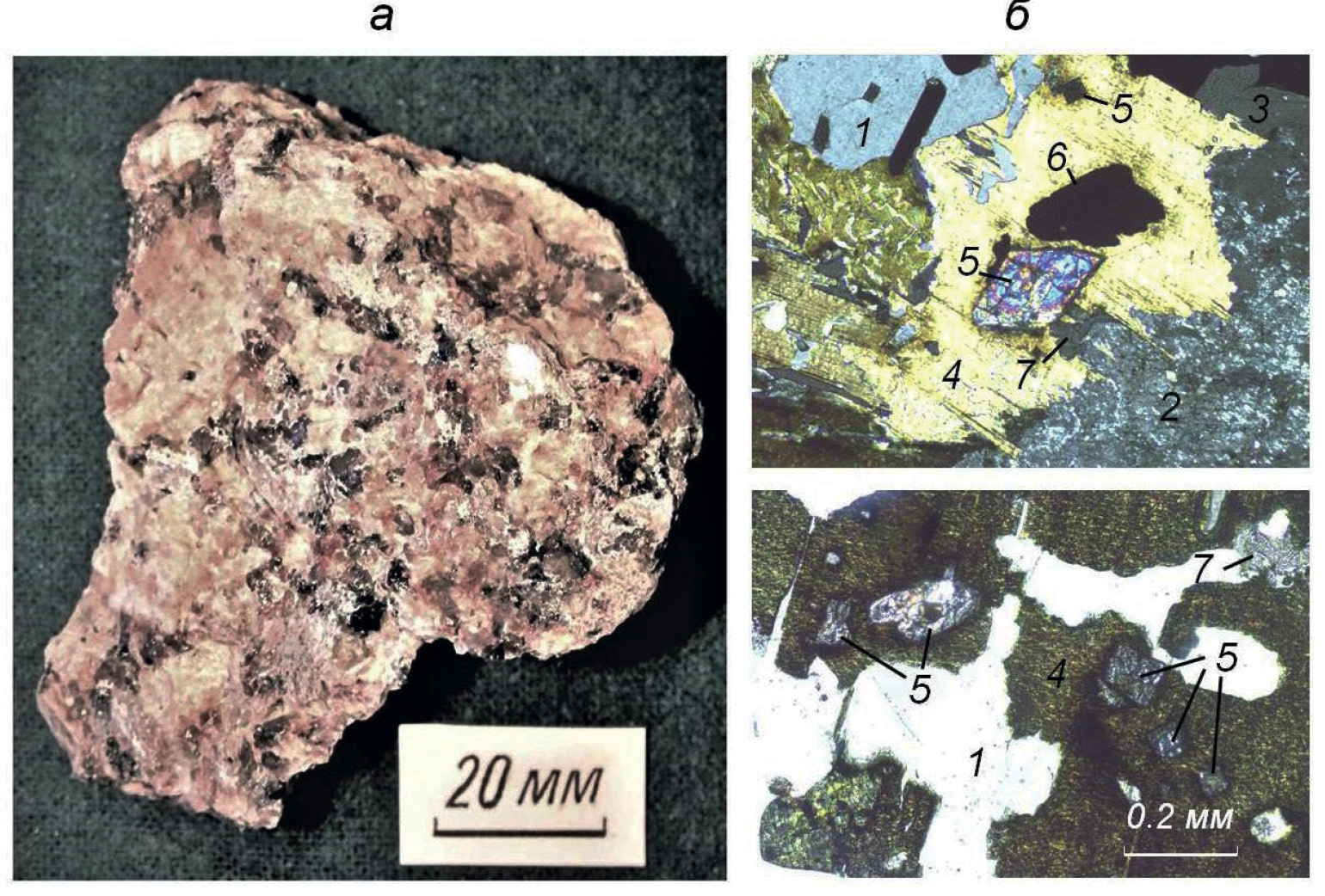 1 — quartz, 2 — microcline, 3 — oligoclase, 4 — biotite, 5 — zircon, 6 — fluorite, 7 — apatite.