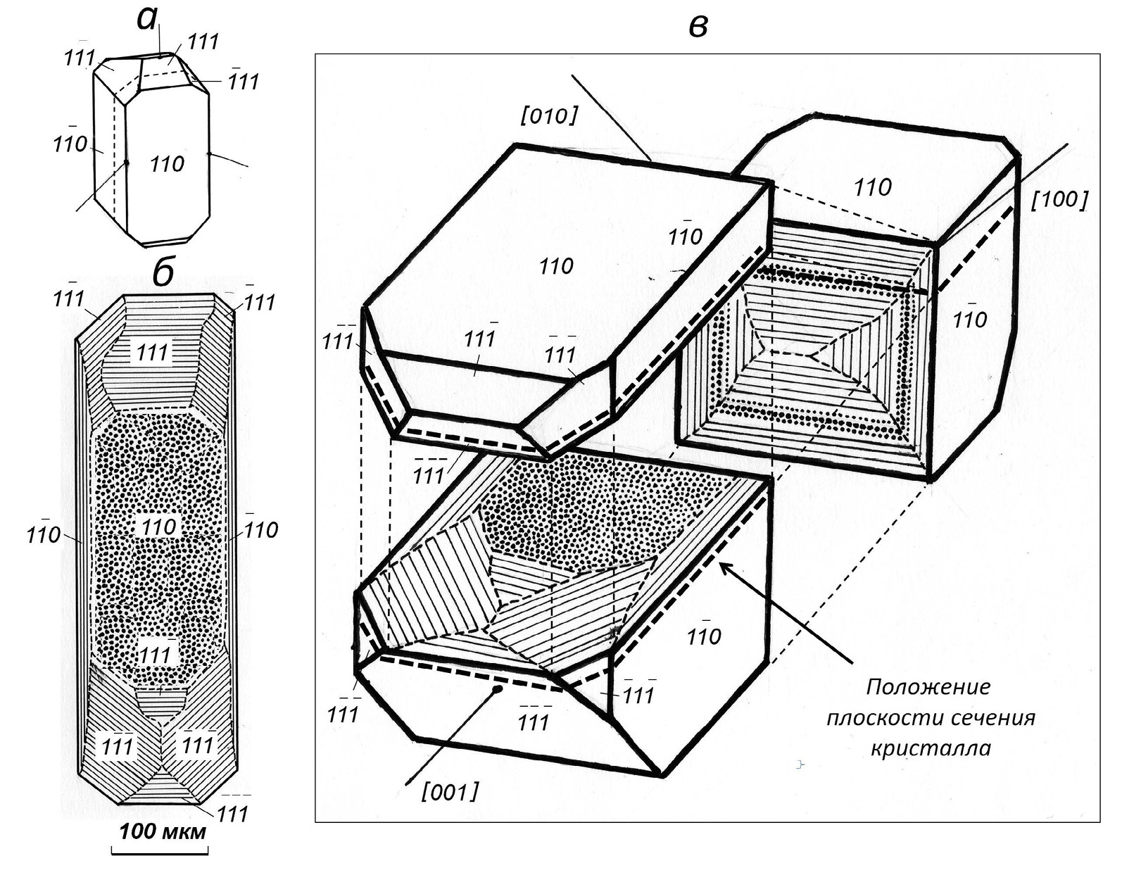 Характерным является наличие темной в CL микрозональной области в центральной части ряда кристаллов, с контурами, субсогласными с внешними гранями. По-видимому, они представляют собой сечения внутренних частей пирамид роста граней тетрагональных призм {100} и {010} (рис. 3). Такие темные области (анализы 1.1, 4.1, 6.1, 8.1, 12.1) либо окаймлены более светлыми тонкозональными оторочками различной мощности (2.1, 6.2, 7.1, 8.2, 12.2), либо занимают всю площадь сечения индивидов (3.1, 5.1, 9.1, 10.1, 11.1) (рис. 2).