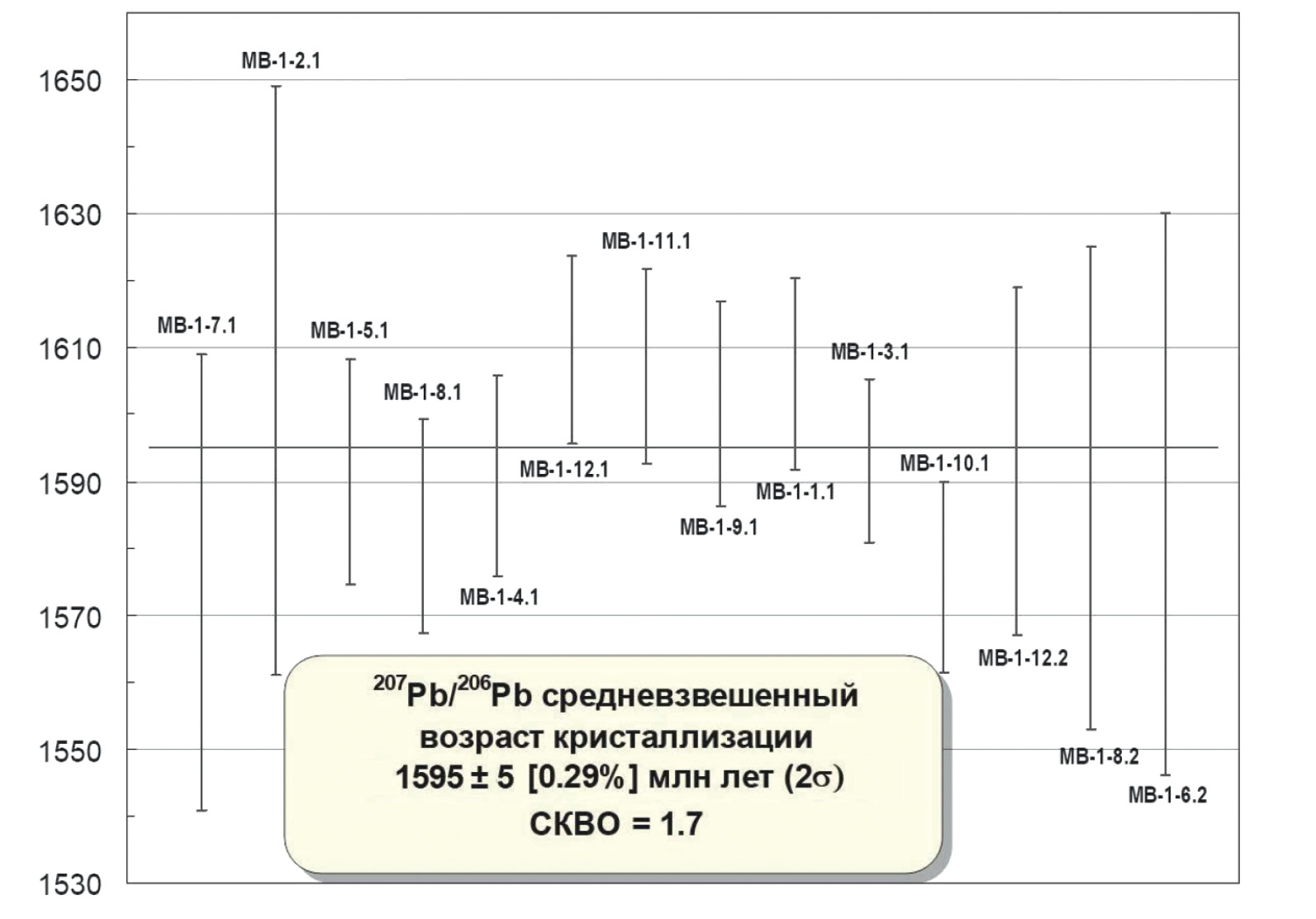Параметры линейной (СКВО = 1.6) зависимости в координатах 206Pb/238U –207Pb/235U по всей совокупности (n = 15) аналитических данных устанавливают возраст кристаллов циркона по верхнему пересечению изохроны с конкордией в 1602 ± 7 млн лет (рис. 4). Мы полагаем, что средневзвешенное значение возраста кристаллизации циркона по отношению 207Pb/206Pb, рассчитанное только по конкордантным и субконкордантным результатам — 1595 ± 5 млн лет (рис. 5), более адекватно и должно рассматриваться как время кристаллизации циркона и, соответственно, возраст породы-носителя составляет около 1595 млн лет.