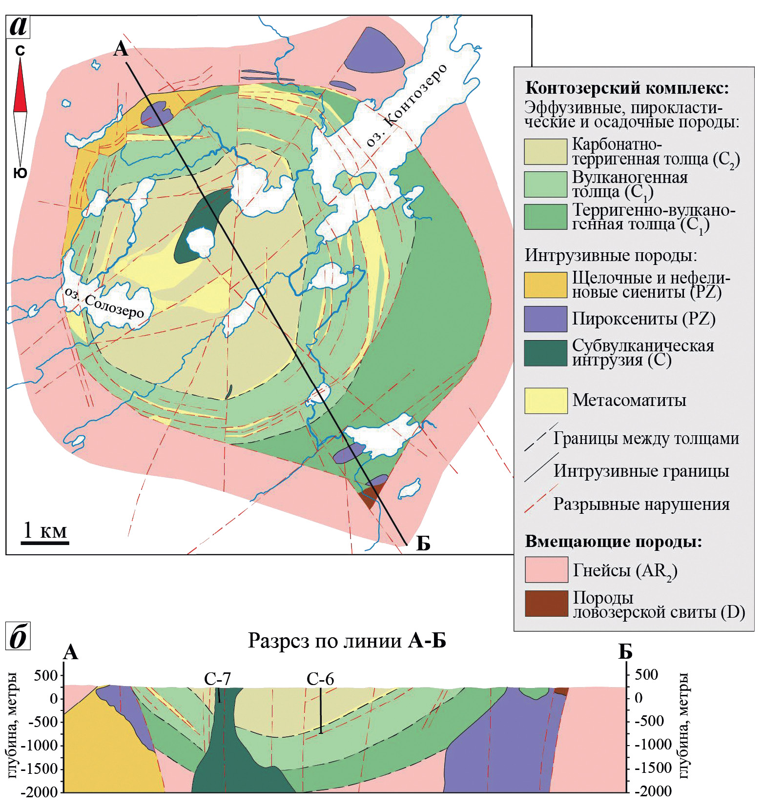 а — геологическая схема; б — разрез по линии А–Б; на разрезе показано положение опорной скважины № 6 (С-6) и поисковой скважины № 7 (С-7), пробуренных Ловозерской ГРП в период с 1970 по 1977 г.