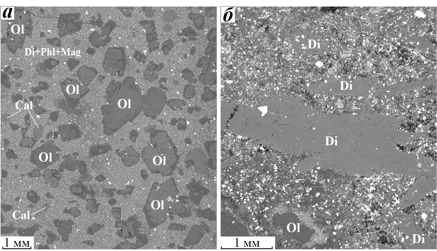 а — с вкрапленниками оливина (образец КТ-30/1); основная масса сложена микролитами диопсида, магнетита, флогопита, присутствует раскристаллизованное вулканическое стекло; б — с вкрапленниками диопсида (преобладают) и оливина (образец КТ-33/1); основная масса сложена диопсидом, магнетитом, перовскитом, нефелином. Cal — кальцит, Di — диопсид, Mag — магнетит, Ol — оливин, Phl — флогопит. Изображения в обратно-рассеянных электронах.
