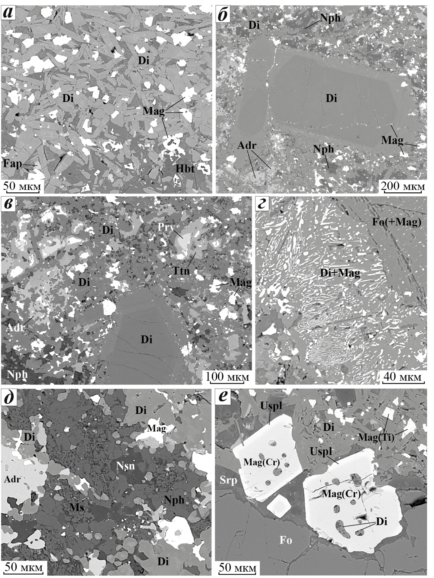Увеличение концентрации кремния и кальция при переходе от меймечитов к фоидитам привело к существенной смене ассоциаций титансодержащих минералов. В меймечитах основными концентраторами титана являются магнетит и ульвошпинель. В фоидитах разнообразие титансодержащих минералов возрастает, и они обычно собраны в сегрегации с зональностью от центра к периферии: обогащенный титаном магнетит («Ti-магнетит») → перовскит → титанит → андрадит/шорломит (рис. 9, а). Образование такой зональности можно представить в виде последовательности схематических реакций: