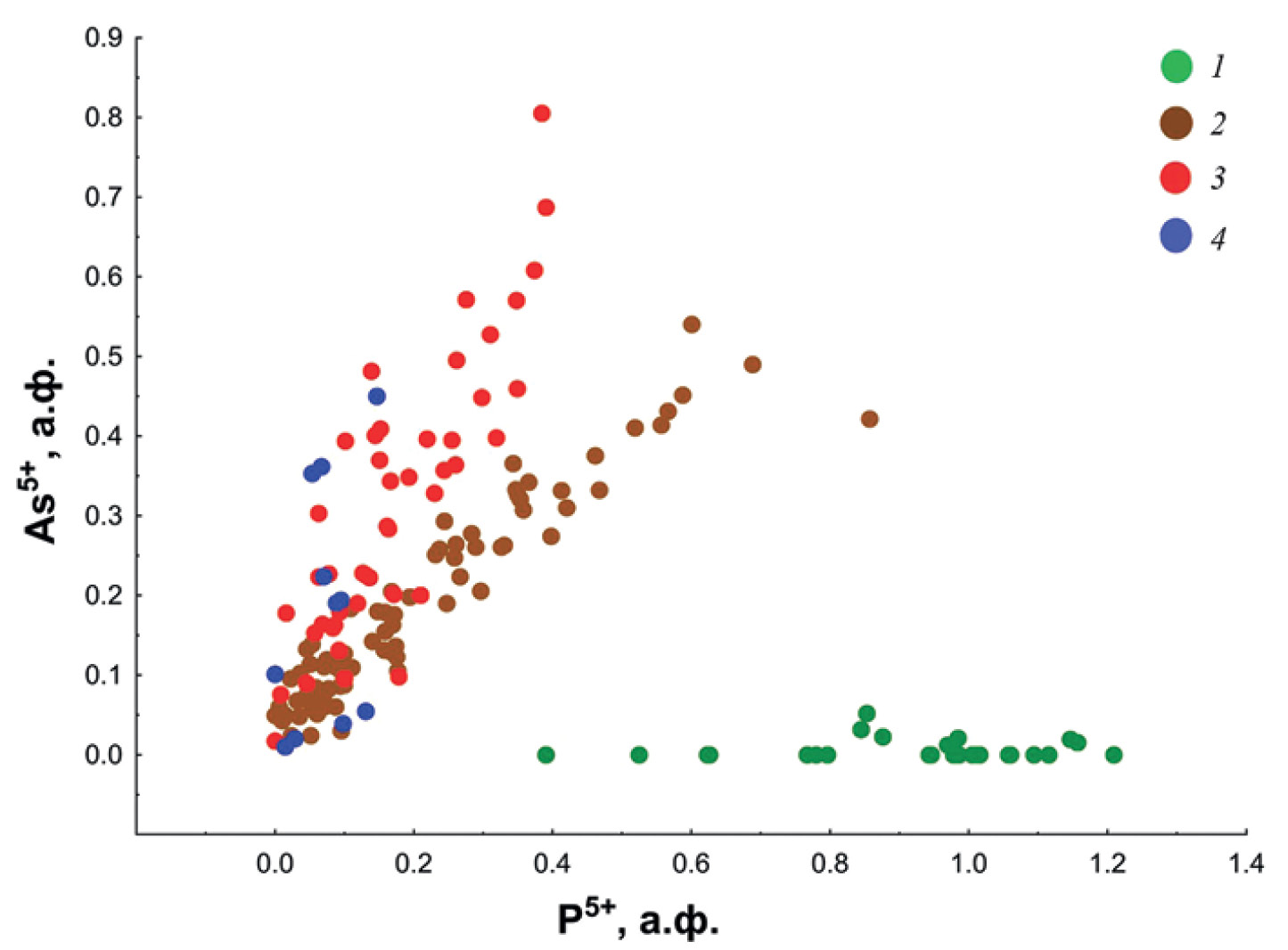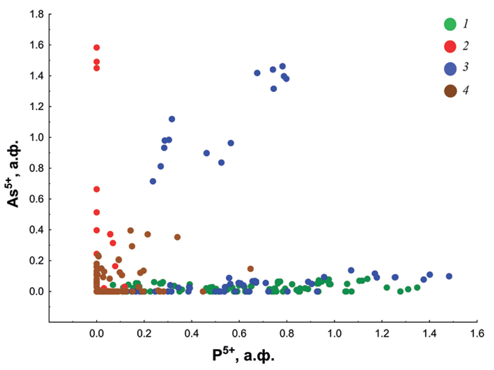 3. Fig. 2. Variations in P and As contents in vanadinite specimens from localities in the CIS (our data). 1 — Berezovskoe deposit, Middle Urals; 2 — Suleiman-Sai deposit, Kazakhstan; 3 — Kyzyl-Espe deposit, Kazakhstan; 4 — Sidzhak ore occurrence, Uzbekistan.