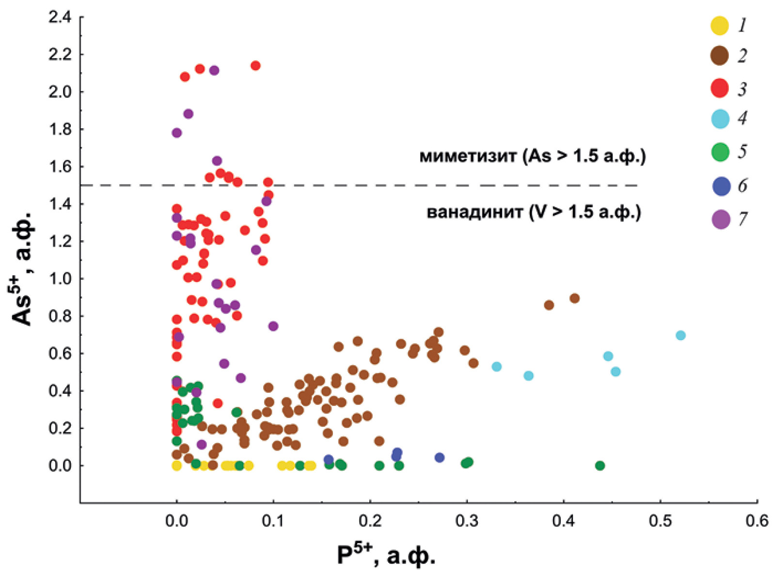 4. Fig. 3. Variations in P and As contents in vanadinite and V-rich mimetite specimens from localities in foreign countries (our data). 1 — Mibladen, Morocco; 2 — Touissit, Morocco; Djebel Mahseur, Morocco; Los Lamentos, Chihuahua, Mexico; Venus mine, Argentina; 3 — Pure Potential mine, Arizona, USA; 4 — Puzzler mine, Arizona, USA; 5 — other localities in the USA (Arizona and New Mexico); Abenab mine, Namibia; 6 — M`Fouati, Republic of Congo; 7 — Bad Bleiberg, Carinthia, Austria. The dotted line separates compositional fields of vanadinite (> 1.5 apfu V5+) and mimetite (> 1.5 apfu As5+).