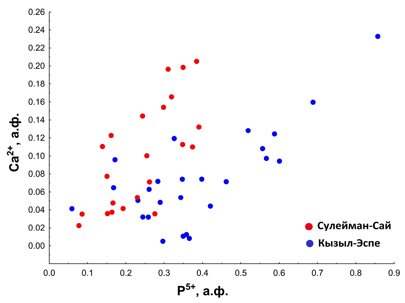 5. Fig. 4. Ca and P contents ratio in vanadinite from Suleiman-Sai and Kyzyl-Espe deposits, both in Kazakhstan (our data).