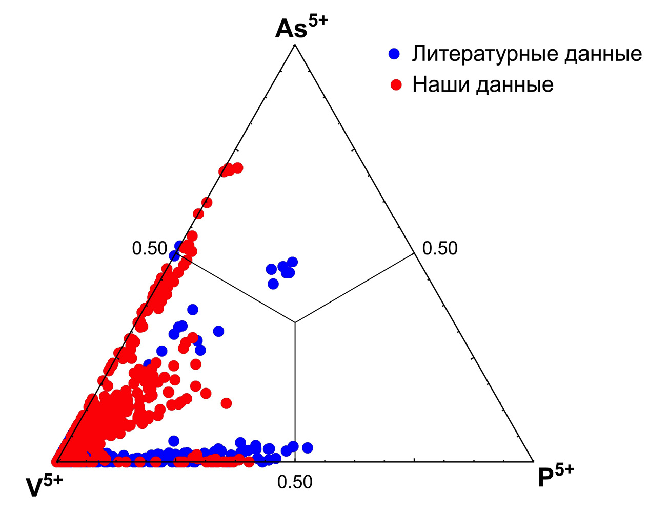 Большинство опубликованных (особенно в «домикрозондовую» эпоху) анализов ванадинита сходны между собой и дают при пересчете эмпирические формулы, близкие к формуле конечного члена Pb5(VO4)3Cl. Изученные образцы в большинстве своем содержат не более 1 (редко до 2) мас.% P2O5 и не более 0.5 (редко до 1) мас.% As2O5. Вариации содержаний фосфора и мышьяка в литературных анализах ванадинита представлены на рис. 1.