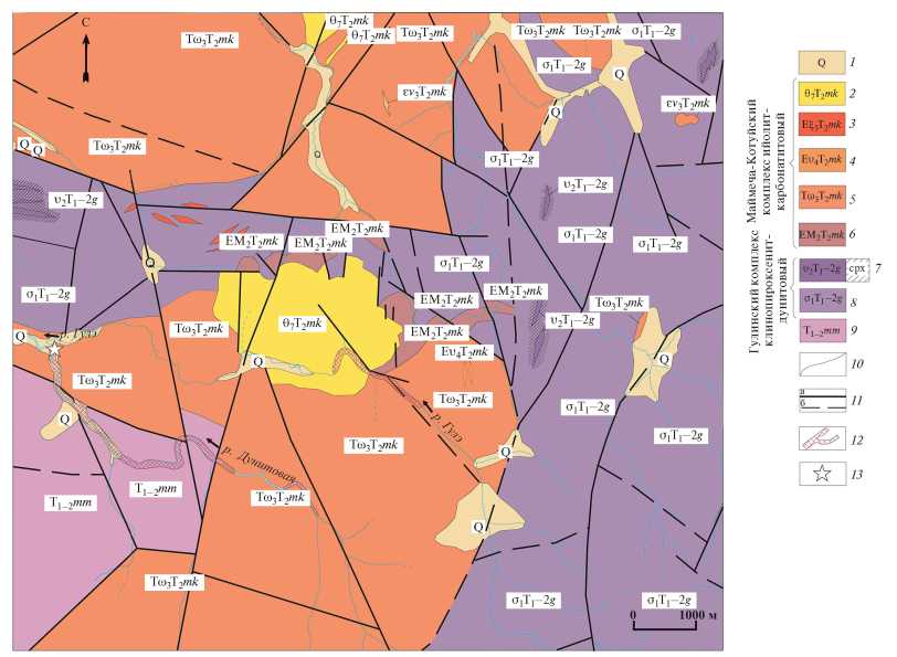 1 – аллювиальные (русла, поймы и террасы), озерные и водно-ледниковые отложения; 2–5 – Маймеча-Котуйский ийолит-карбонатитовый комплекс: 2 – карбонатиты седьмой фазы комплекса; 3 – нефелиновые и щелочные сиениты пятой фазы комплекса; 4 – биотит-пироксеновые ультрамафиты, малиньиты и шонкиниты третьей фазы комплекса; 5 – мелилитовые породы второй фазы комплекса; 6, 7 – Гулинский клинопироксенит-дунитовый комплекс: 6 – дуниты (первая фаза), 7 – клинопироксениты (вторая фаза); cpx – метасоматические ореолы оливин-клинопироксенового состава (оливиновые клинопироксениты, верлиты, клинопироксеновые дуниты); 8 – меймечиты, лавобрекчии и туфы меймечитов, 9 – геологические границы; 10 – разломы (a – достоверные, б – предполагаемые); 11 – промышленные россыпи золота; 12 – место отбора образцов россыпного золота.