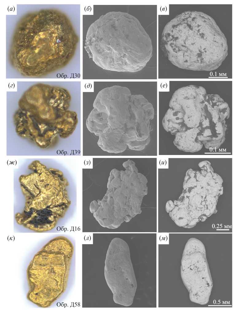 Всё разнообразие встречаемых форм самородного золота было сгруппировано в составе четырех основных морфологических типов (рис. 3): каплевидно-округлого, комковатого, уплощенно-комковатого и пластинчатого. К каплевидно-округлым разновидностям были отнесены наиболее округлые по форме зерна со слабо шагреневым, мелкоячеистым рельефом поверхности (рис. 3, а, рис. 5, обр. Д15, Д30, Д42). Преобладающими формами зерен среди них являются каплевидные, шарообразные, идиоморфные и некоторые другие, в плане близкие к форме круга. Комковатые зерна внешне похожи на каплевидно-округлые, но обладают более сложными очертаниями (рис. 3, б; рис. 5, обр. Д8, Д20, Д41); для них типичен средне-шагреневый рельеф. Уплощенно-комковатые зерна характеризуются овальной формой, часто они заметно вытянуты и приплюснуты. Для них типичен рельеф поверхности от грубо-шагреневой до пупырчатой (рис. 3, в; рис. 5, обр. Д38, Д48, Д57). Пластинчатые зерна, как правило, наиболее тонкие. Они обладают пластинчатой, чешуйчатой, дисковидной и некоторыми другими формами, с рельефом поверхности не отличимой от таковой для уплощенно-комковатых зерен (рис. 3, г; рис. 5, обр. Д56).