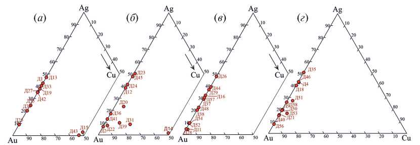 Рис. 10. Состав полиминеральных ассоциаций зерен золота Д7 (а) и Д8 (б) из россыпи р. Дунитовой на диаграмме Au-Cu-Ag. На диаграмму нанесены изотермы тройного твердого раствора по экспериментальным данным (Дриц и др., 1979). Точки с цифрами 1–29 – места проведения рентгеноспектральных микроанализов, соответствующие таковым номерам в табл. 4.