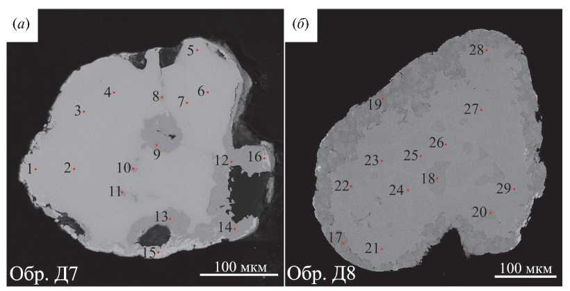 Fig. 10. Au-Cu-Ag composition diagram (wt %) for gold minerals within heterogeneous grains D7 (а) and D8 (б) from placer deposit of the Dunitovaya River. The diagram shows isotherms of a ternary solid solution based on experimental data (Dritz et al., 1979). Points with numbers 1–29 denote areas of EMP analyses corresponding to the same numbers in Table 4.