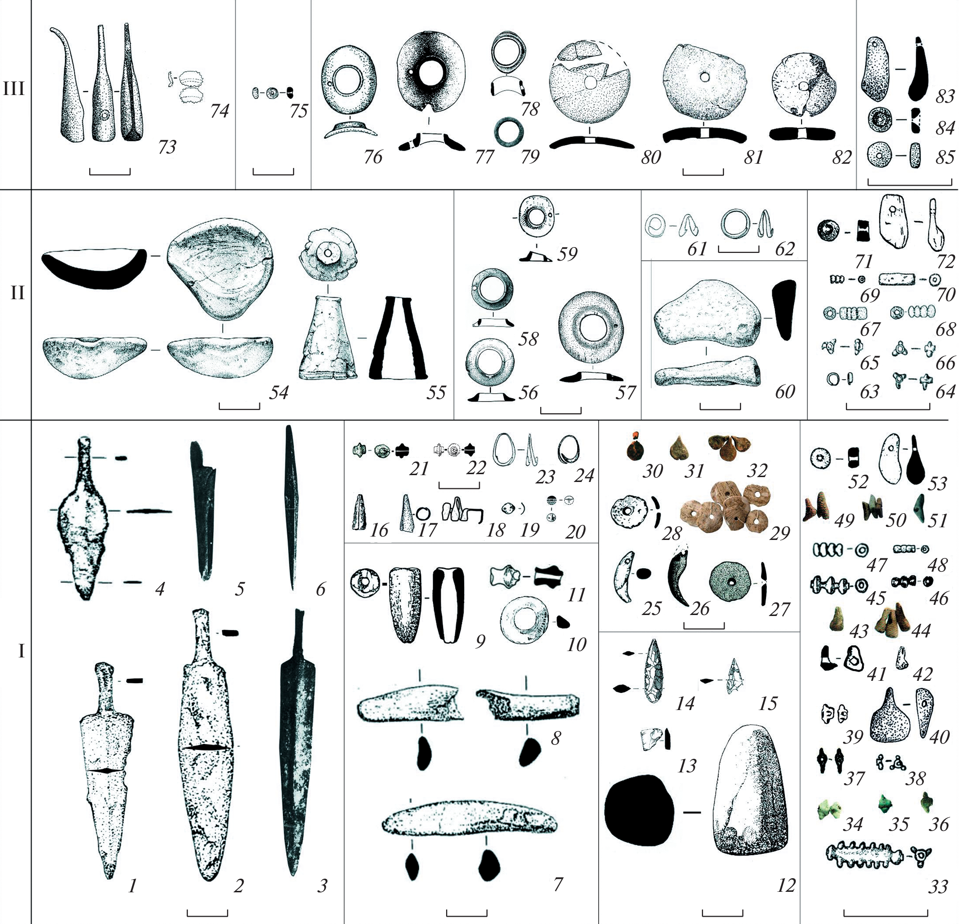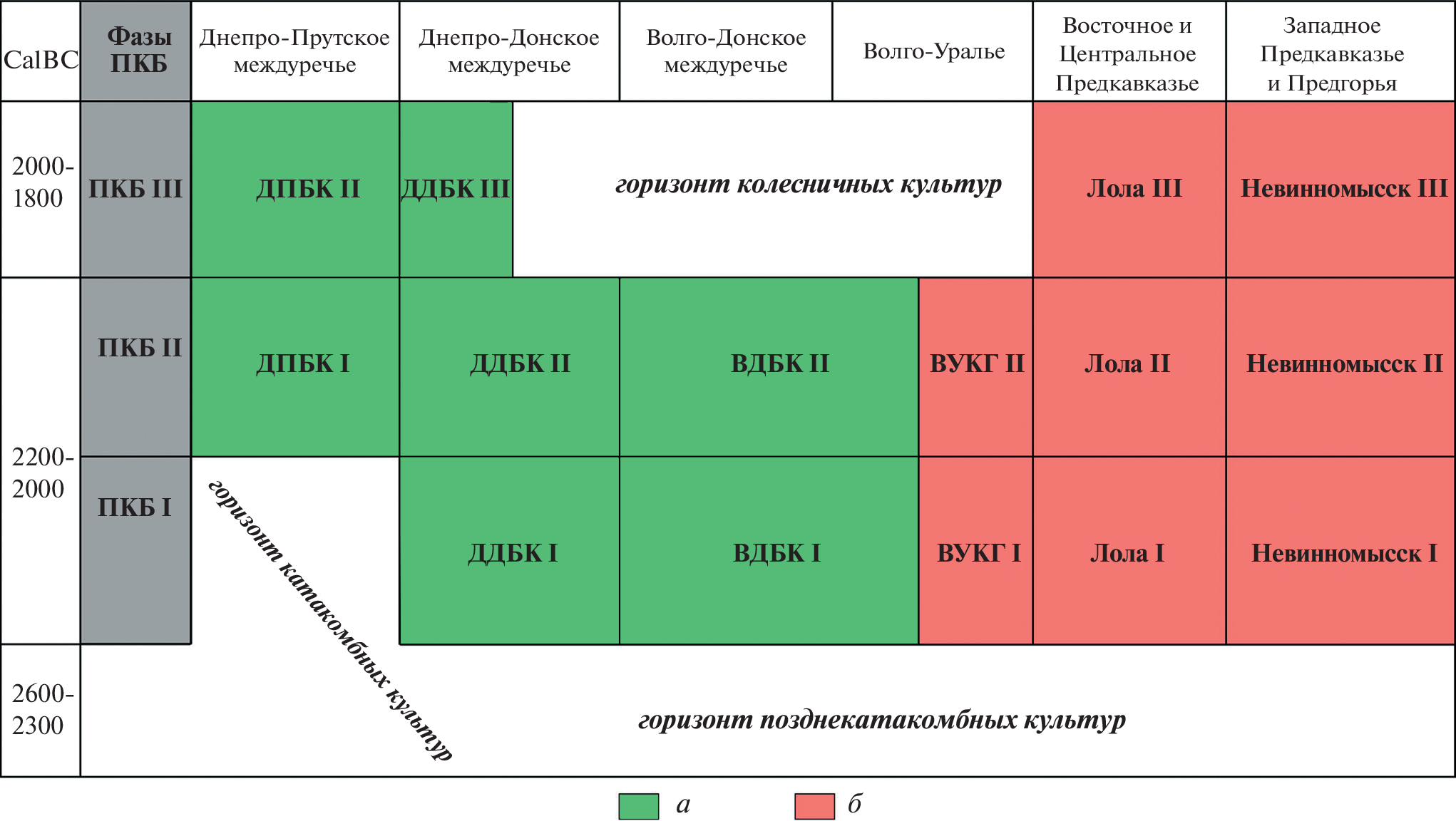 The article presents characteristics of a new cultural formation in the Western and Southern Ciscaucasia of the post-Catacomb period – the Nevinnomyssk culture represented by burial sites. Burials were made in pits and occasionally in niche graves, the skeletons are arranged in a crouched adorative position, the skulls are oriented mainly to the east and southeast. The grave goods include ceramic ware, a metal tool complex, bone belt buckles and pendants, and a set of various ornaments. An analysis of the material made it possible to identify two local variants in the Nevinnomyssk culture: southeastern and northwestern. Materials of the first one show influences of the neighbouring Dnieper-Don Babino culture, while the second one demonstrates influence of the Lola culture. In its development, the Nevinnomyssk culture went through three stages within 2200–1800 CalBC. It is an integral part of the block of post-catacomb cultural formations and an important component of Lola cultural circle.