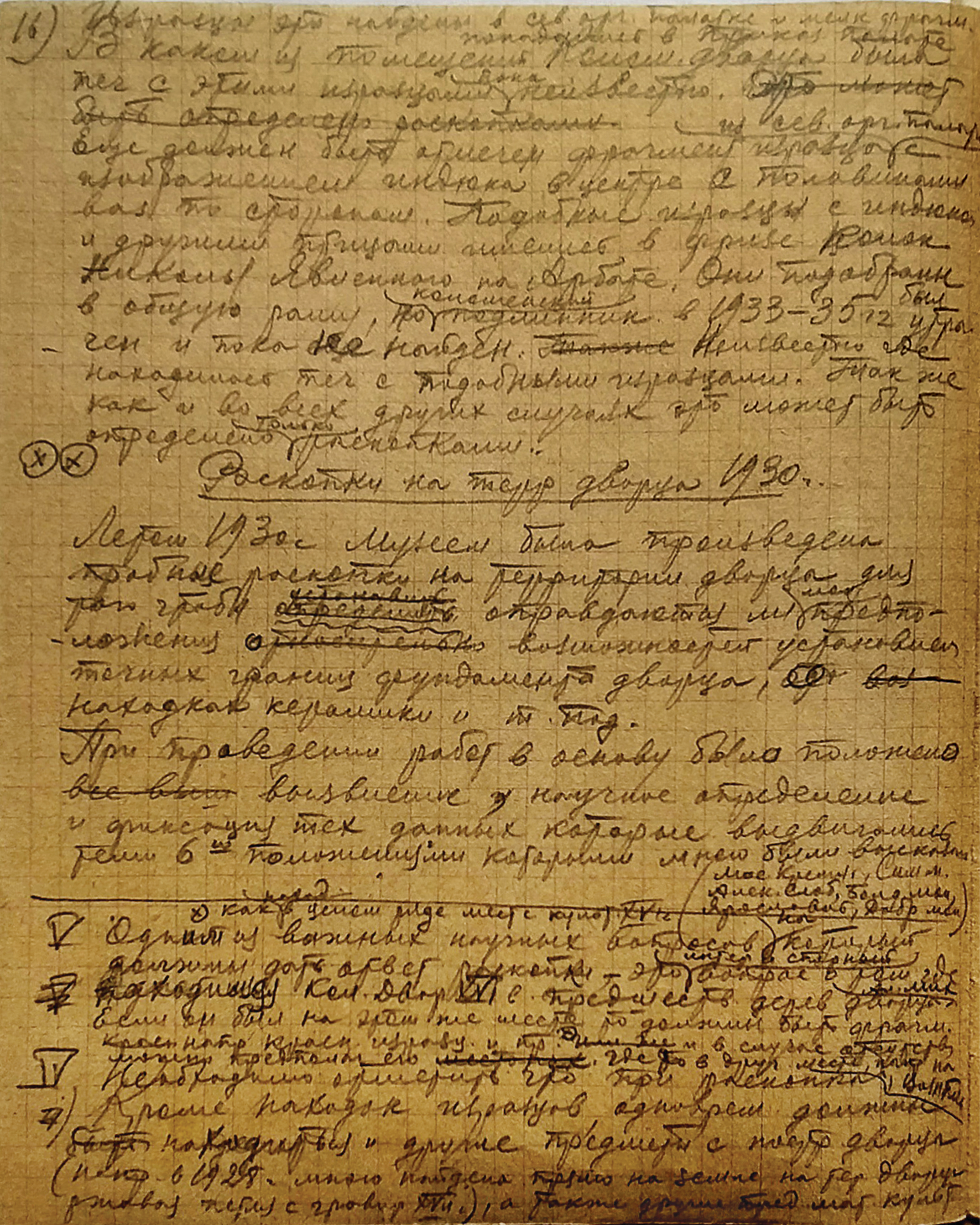 The article addresses the question of the need to publish a part of the archive of the renowned 20th century architect-conservator Pyotr Dmitrievich Baranovsky. It is associated with his studying of the regal residence of the 16th–19th centuries in the settlement of Kolomenskoye (now the territory of Moscow). This paper publishes part of the review of archaeological works in Kolomenskoye compiled by the researcher in the 1940s and newly found in his archive. The document contains a brief account of the 1930 excavations at the site of the “Wooden Palace of Tsar Alexei Mikhailovich”, a Moscow’s masterpiece of architecture. So far, no materials recording these works have been known. The found document also includes a description of the restoration of the palace’s stone structures conducted by P.D. Baranovsky in 1923–1928 and presents the context of the archaeological work of 1933 and 1935. Particular attention is paid to the reconstruction of the layout of the palace on the ground and the localization of its stoves, as well as the characteristics of their tiled decor. The article also publishes the analytical graphics by the architect of the 1940s associated with the reconstruction of the remains of the palace and the development of its new model.