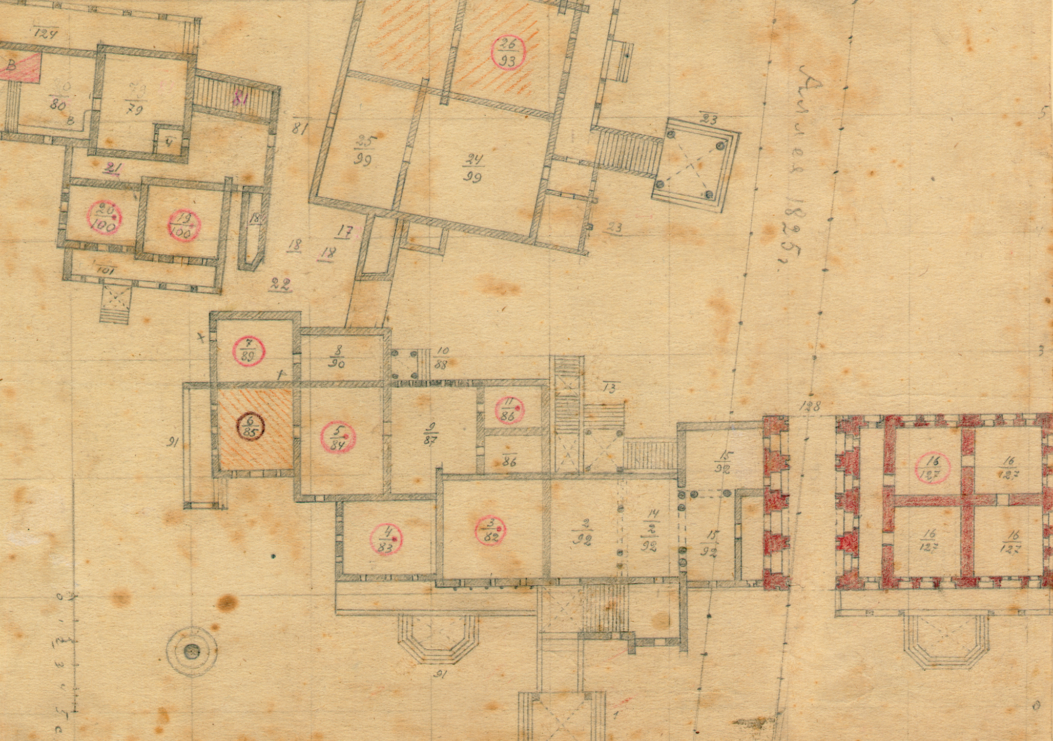 - Gosudarstvennyy nauchno-issledovatel’skiy muzey arkhitektury [State Research Museum of Architecture], OF‑5112/45. Kolomenskoe. Derevyannyy dvorets. XVII v. Kroki. Plany dvortsa i raskopok [Kolomenskoye. Wooden palace of the 17th century. Rough sketches. Plans of the palace and excavations].