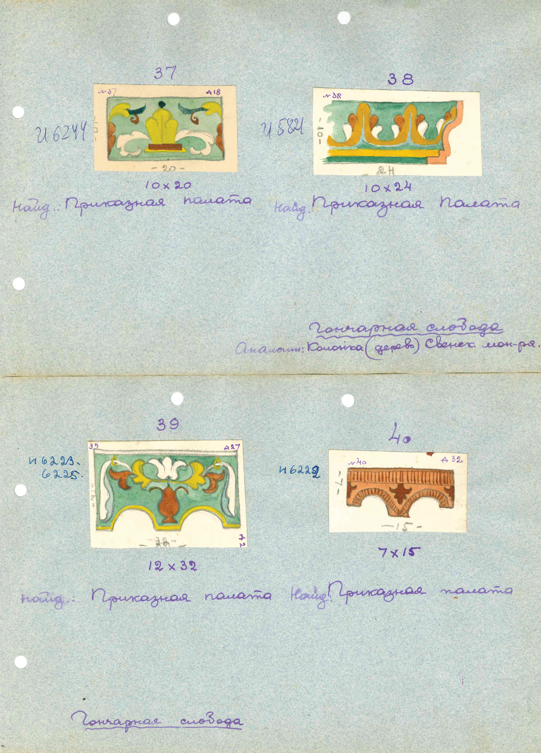 - Gosudarstvennyy nauchno-issledovatel’skiy muzey arkhitektury [State Research Museum of Architecture], OF‑5112/58. Kolomenskoe. Foto: izraztsy polikhromnye XVII v. iz Kolomenskogo [Kolomenskoye. Photo: polychrome tiles of the 17th century from Kolomenskoye].