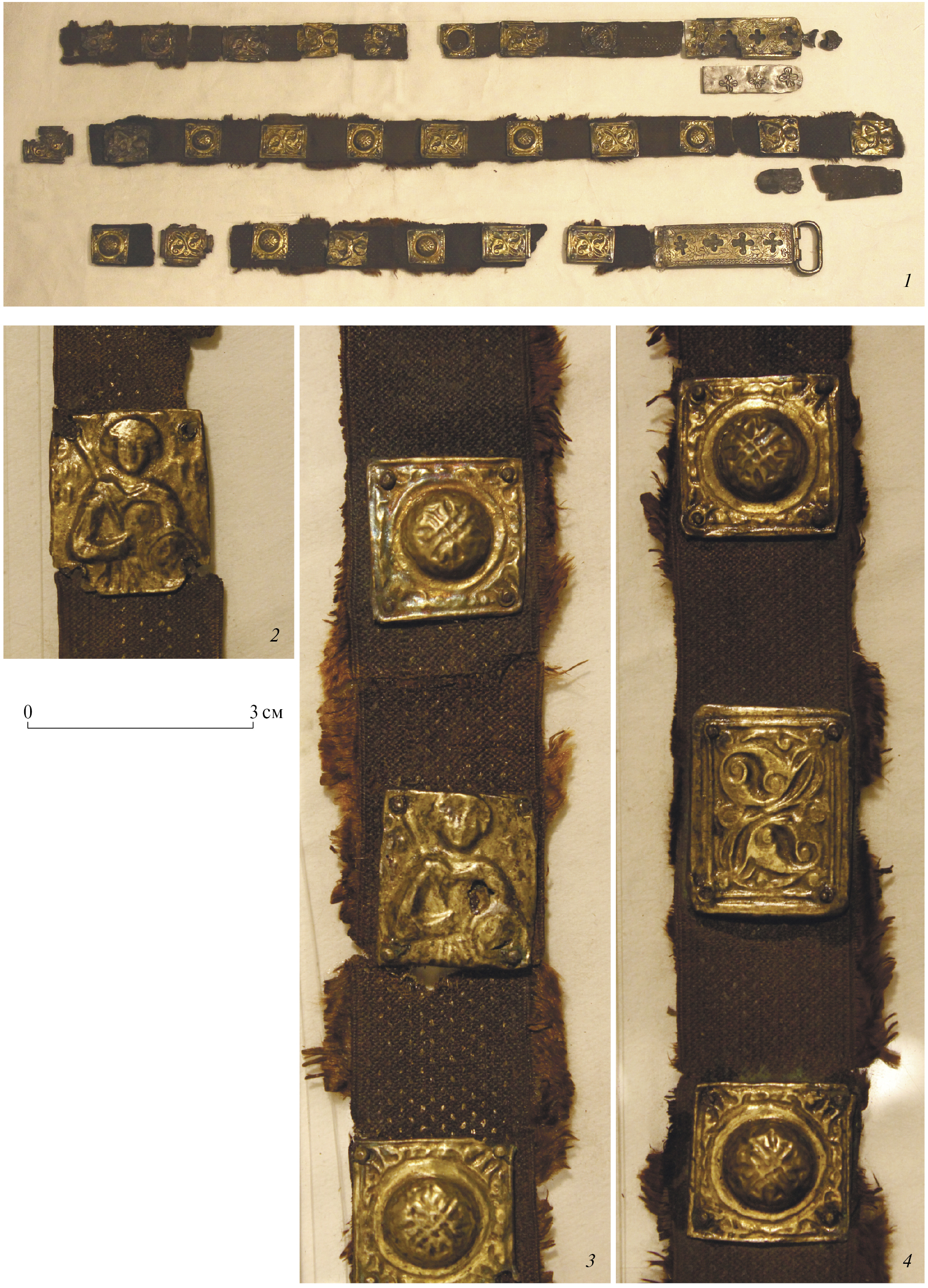 Рис. 1. Поясной набор на тесьме. Государственный Эрмитаж, инв. № ТБ-306. 1 – общий вид. 2–4 – поясные бляшки на тесьме.
